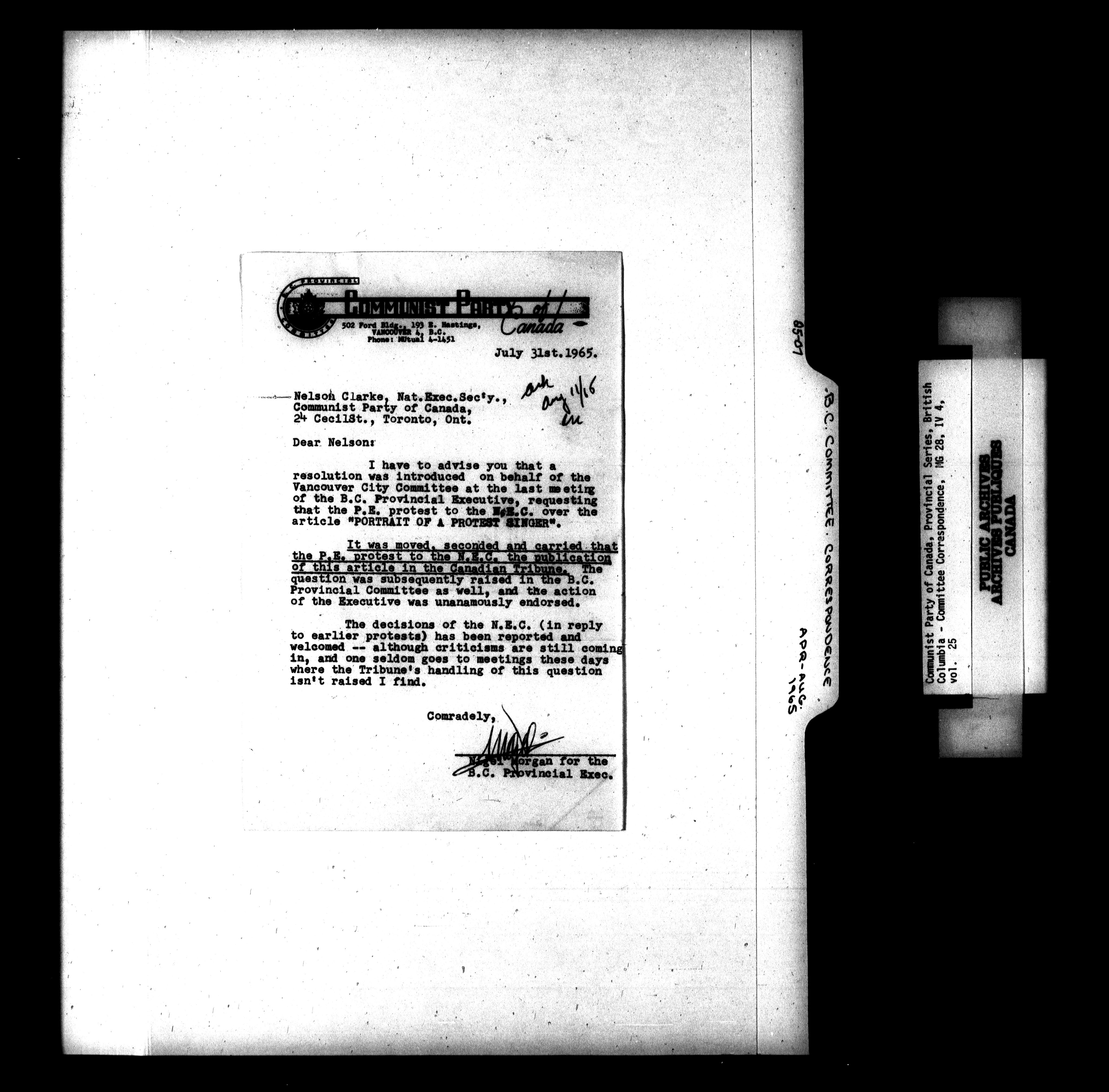 Communist Party of Canada : Provincial series, British Columbia - Committee correspondence - 1594