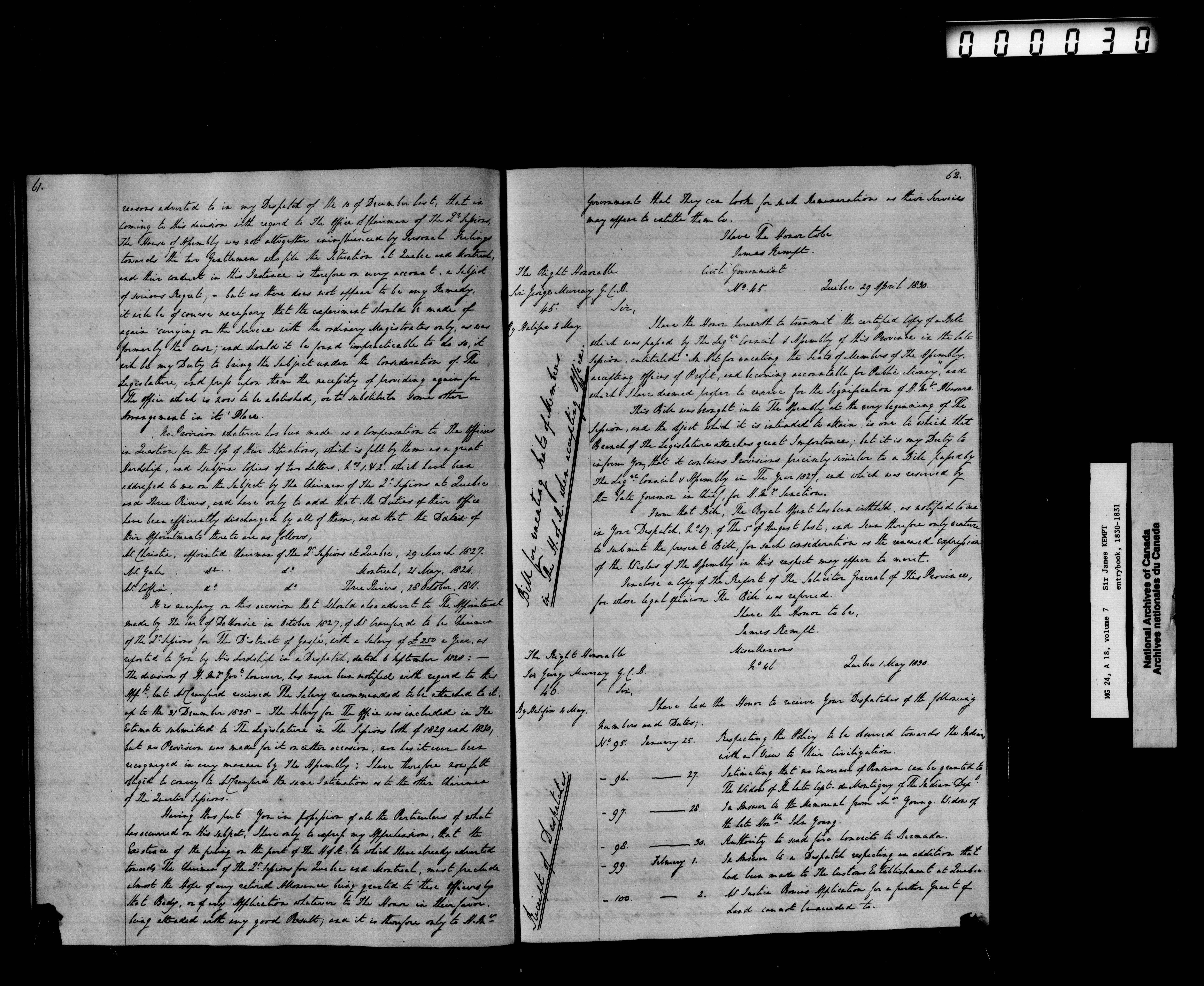 - Sir James Kempt papers - 1831