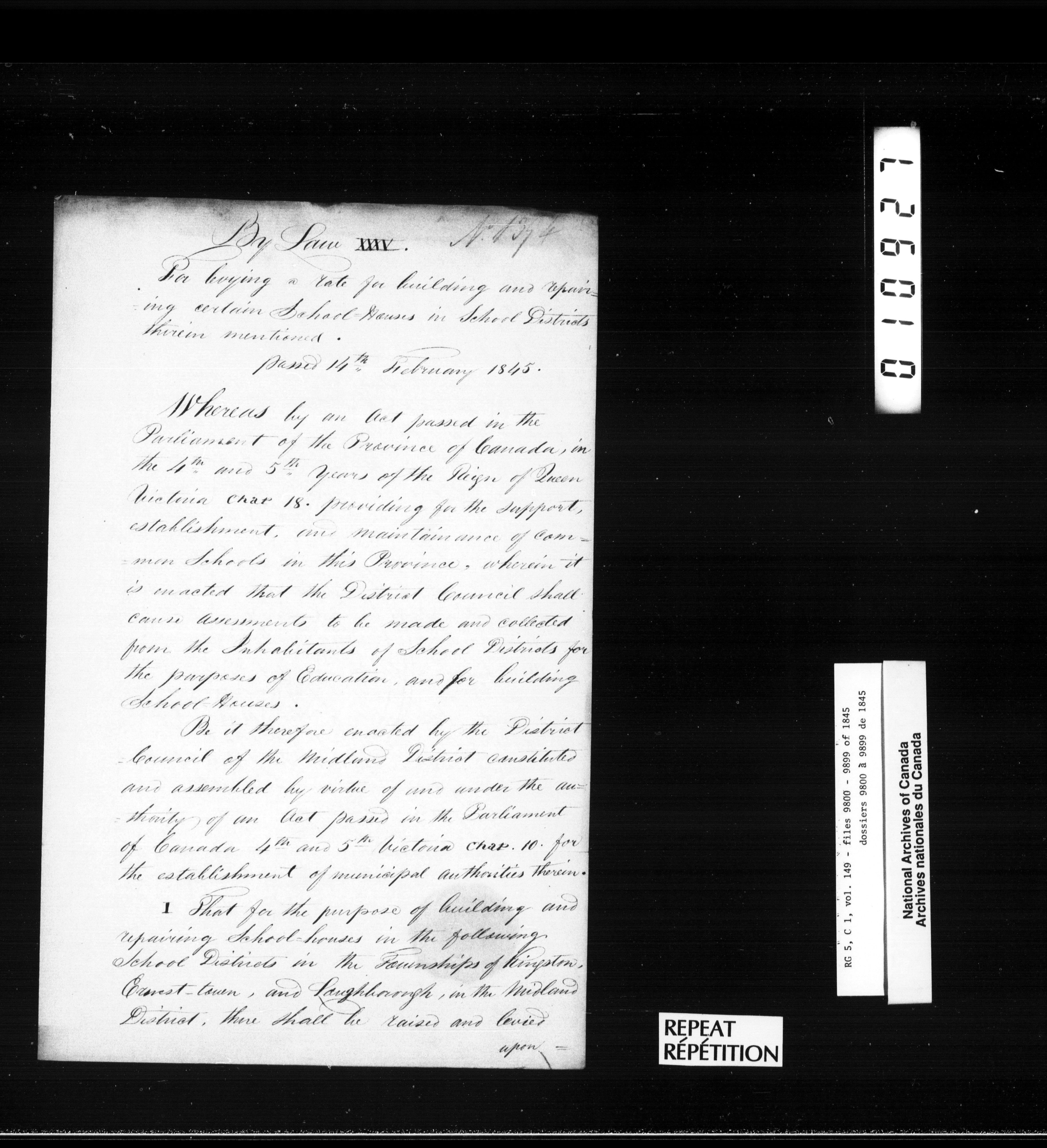 Canada West : Provincial Secretary, numbered correspondence files, 1844 to 1867 : H-2357