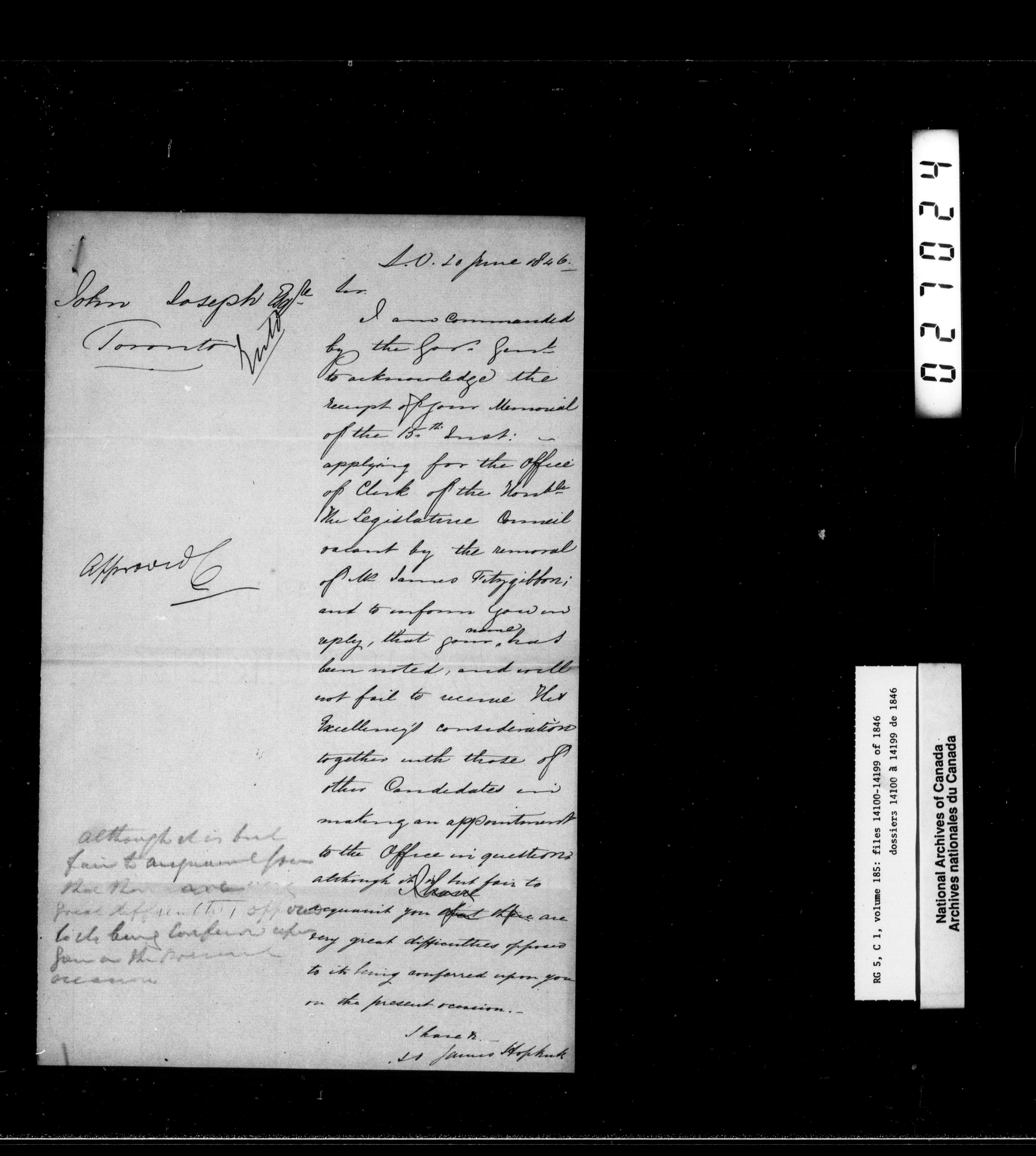 Canada West : Provincial Secretary, numbered correspondence files, 1844 to 1867 - 2367