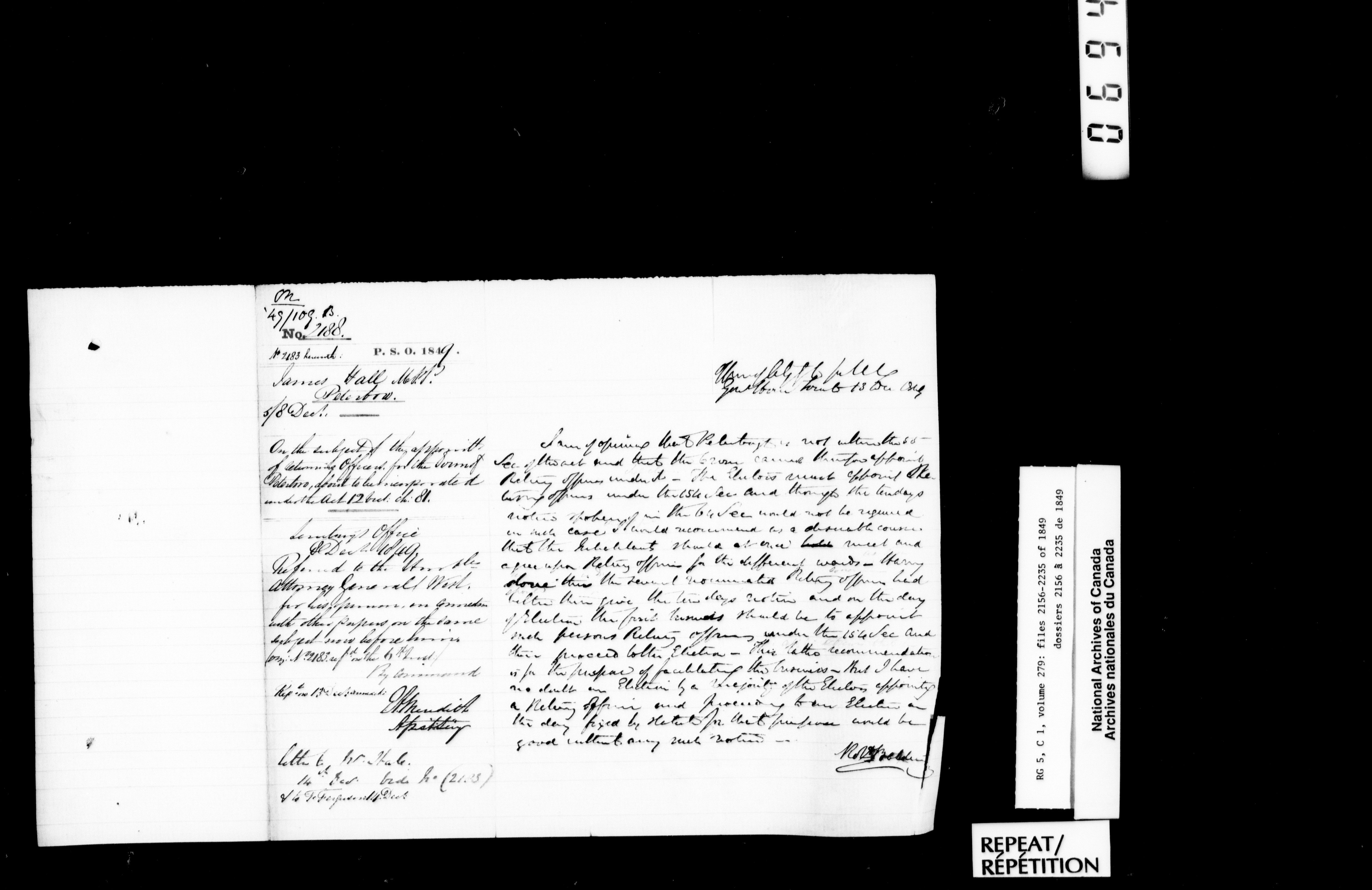 Canada West : Provincial Secretary, numbered correspondence files, 1844 to 1867 - 2398