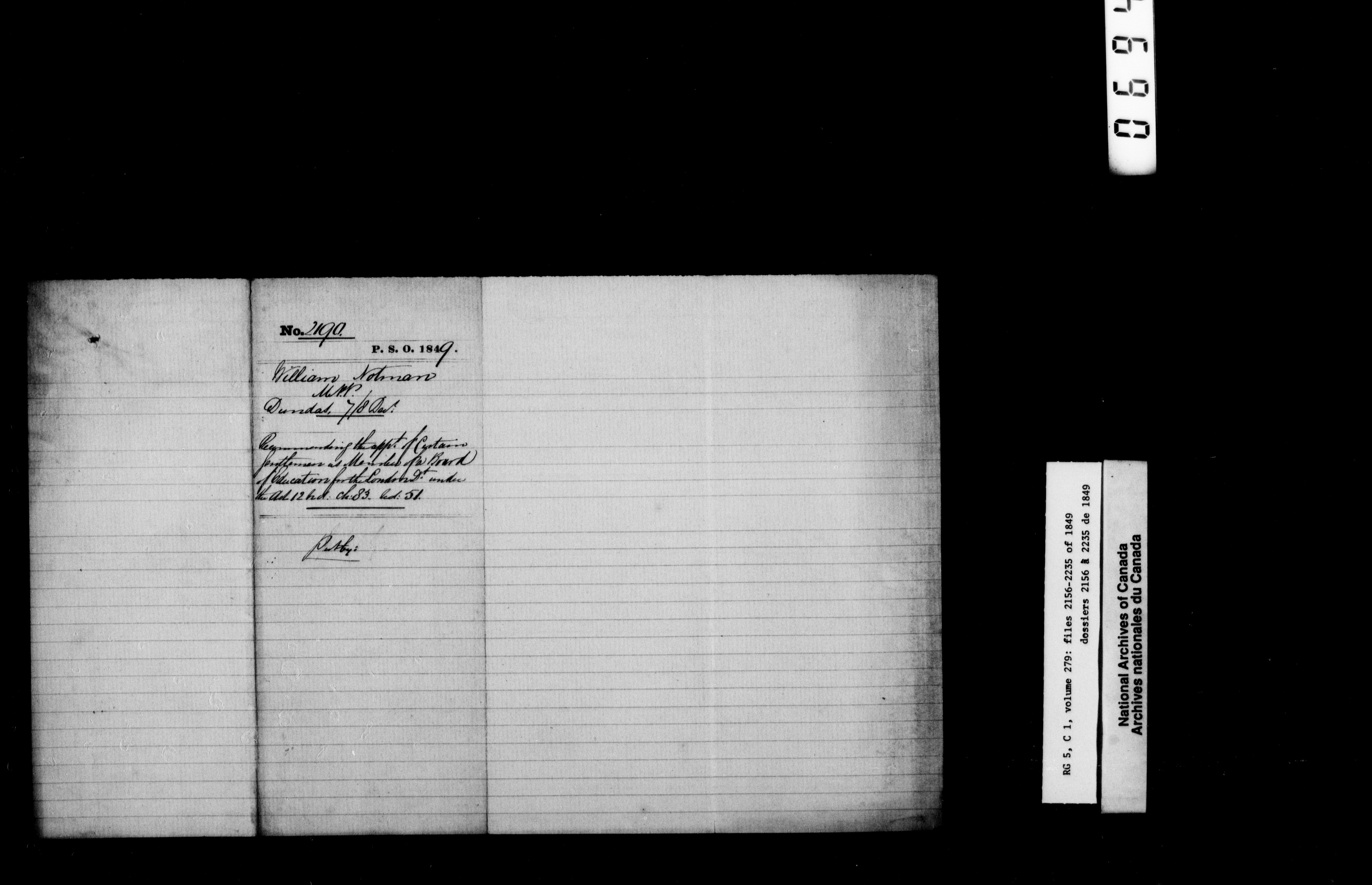 Canada West : Provincial Secretary, numbered correspondence files, 1844 to 1867 - 2398