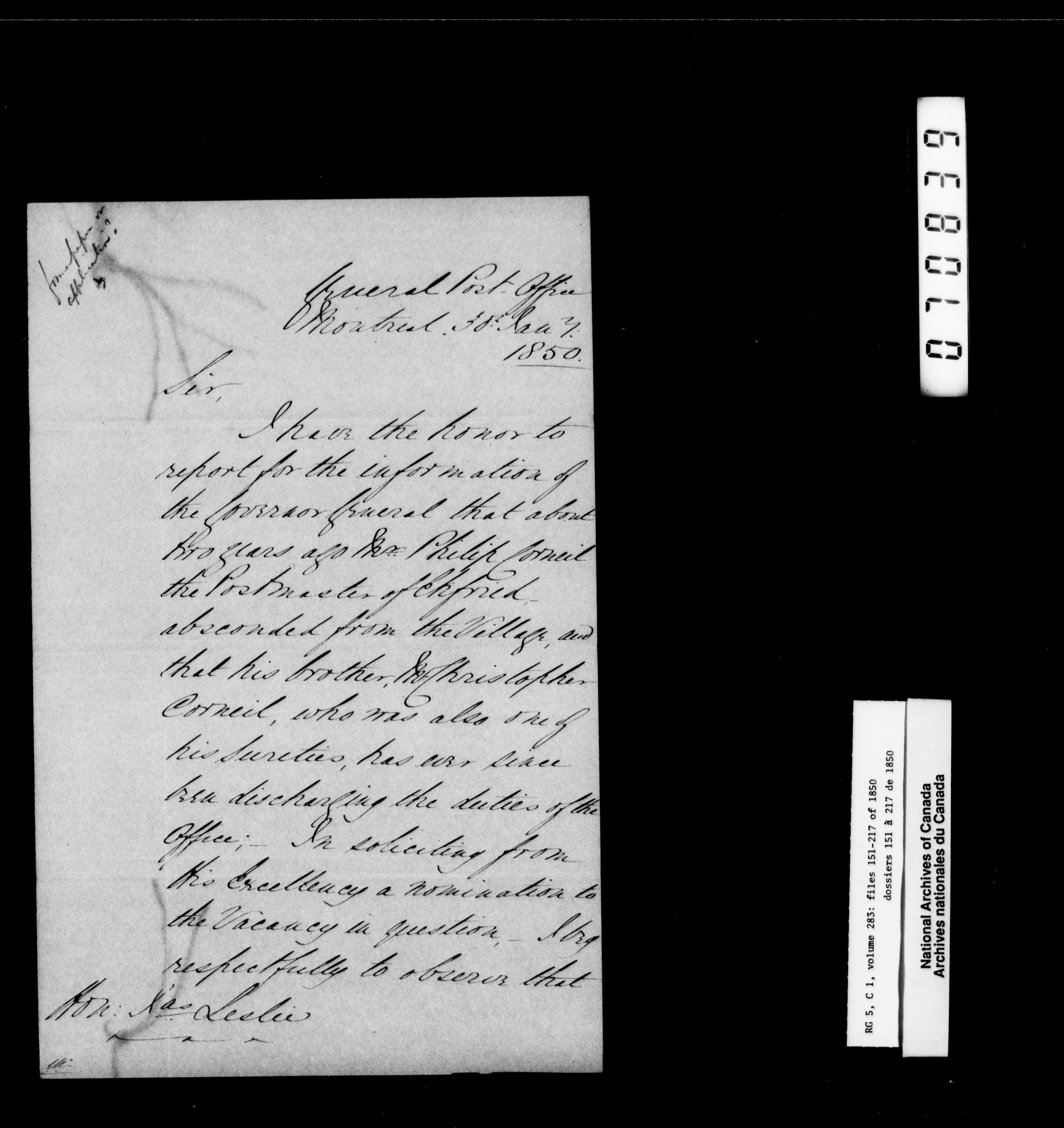 Canada West : Provincial Secretary, numbered correspondence files, 1844 to 1867 - 2399