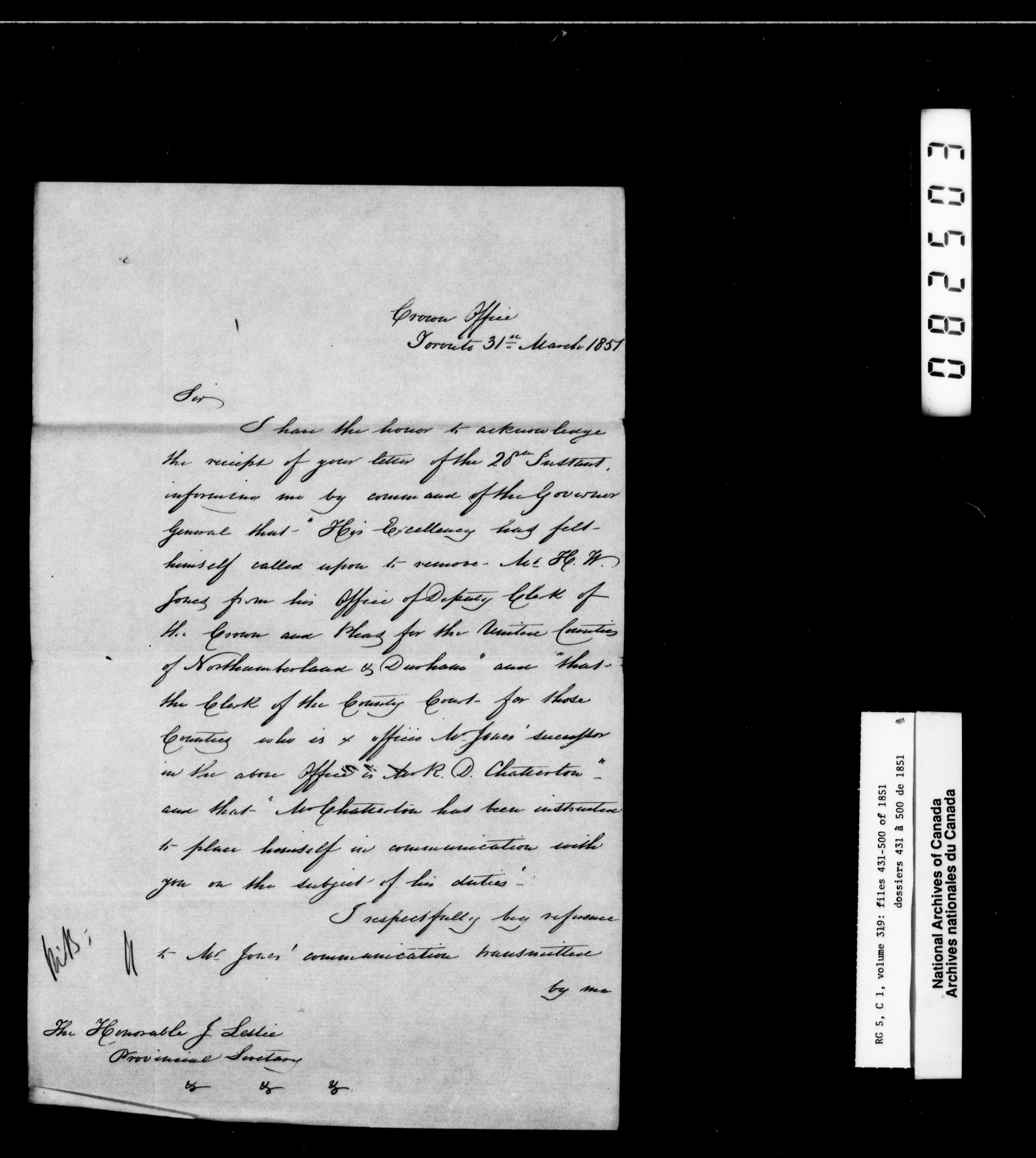 Canada West : Provincial Secretary, numbered correspondence files, 1844 to 1867 - 2407
