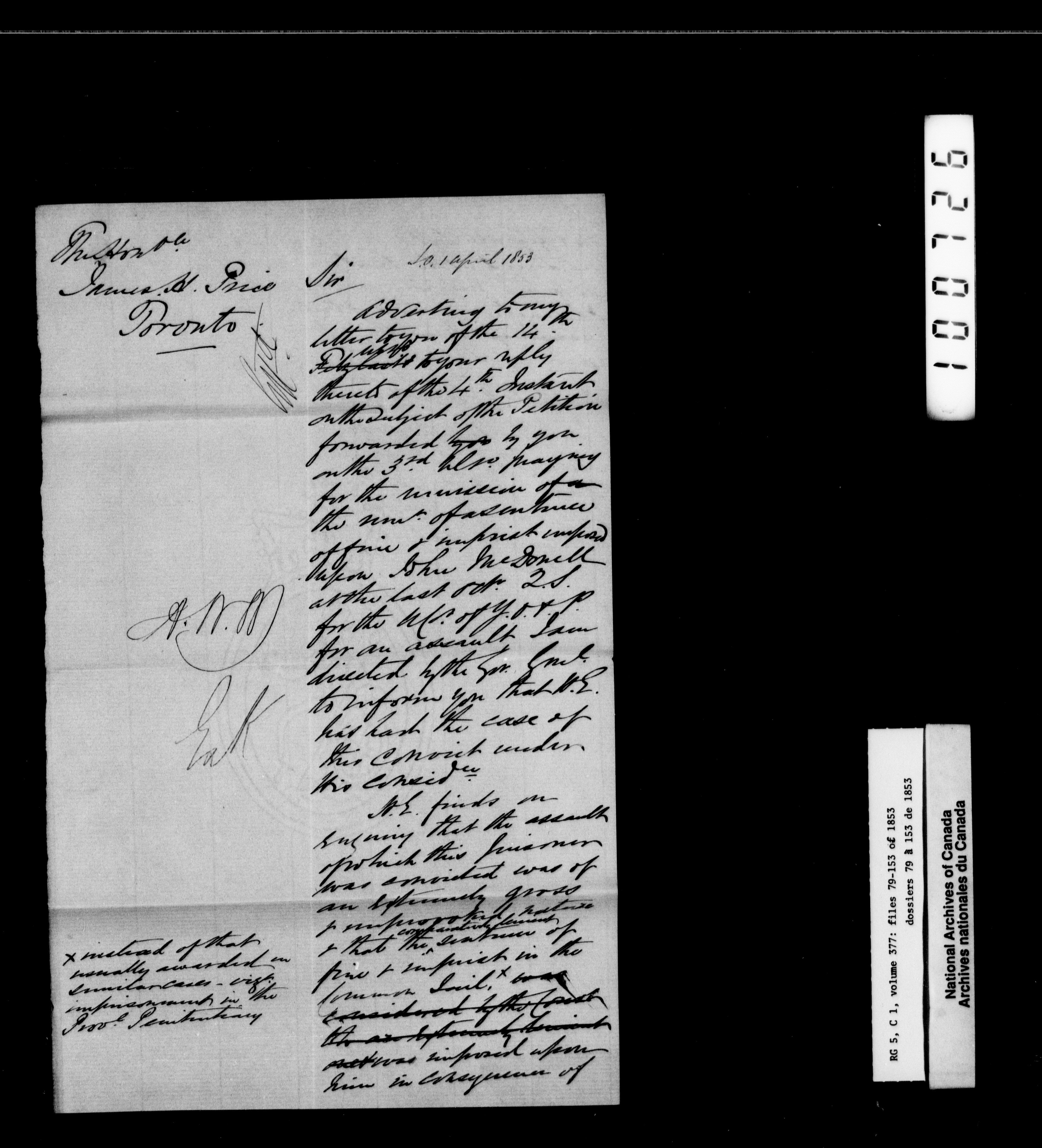 Canada West : Provincial Secretary, numbered correspondence files, 1844 to 1867 - 2420