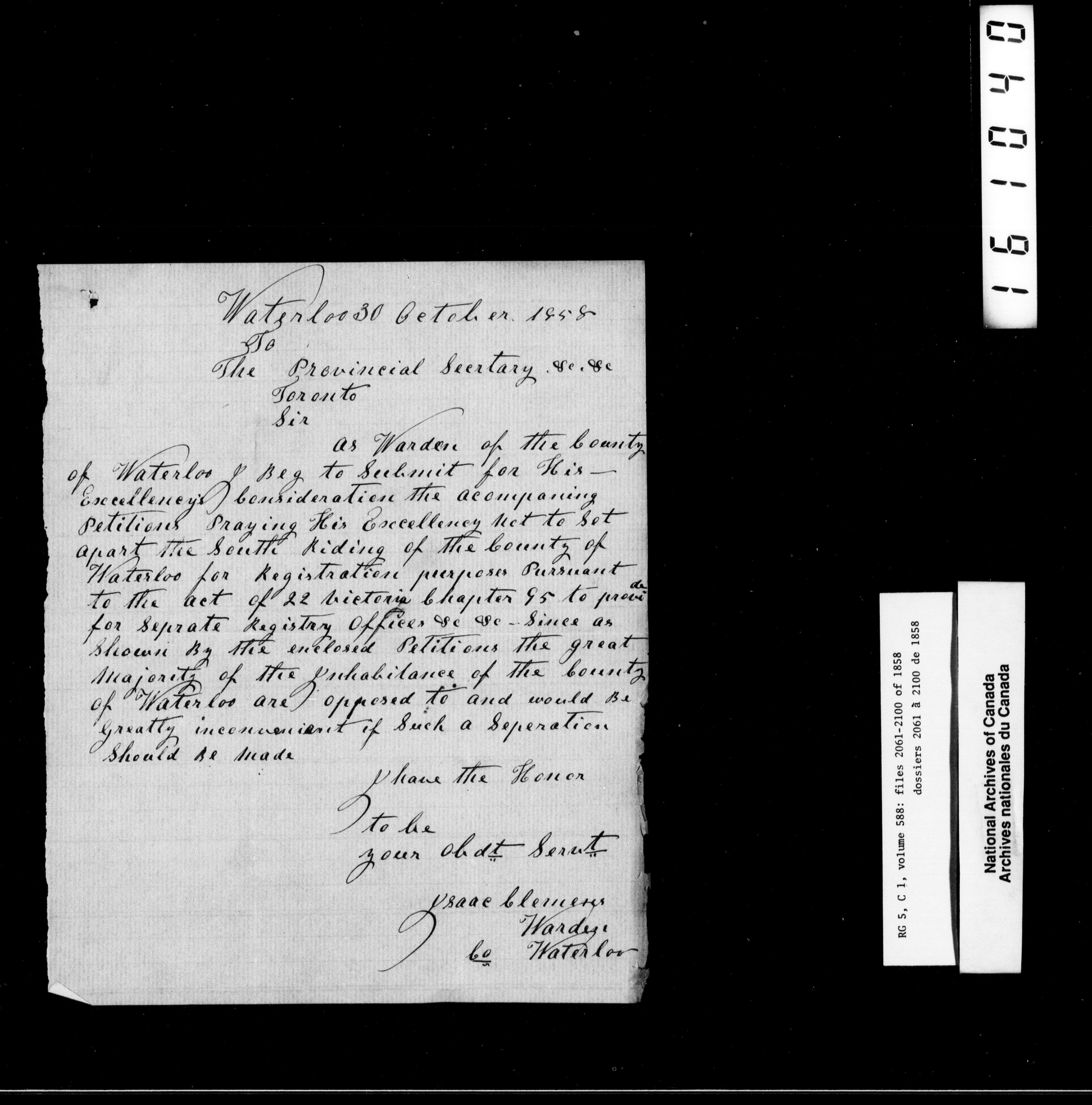 Canada West : Provincial Secretary, numbered correspondence files, 1844 to 1867 - 2461