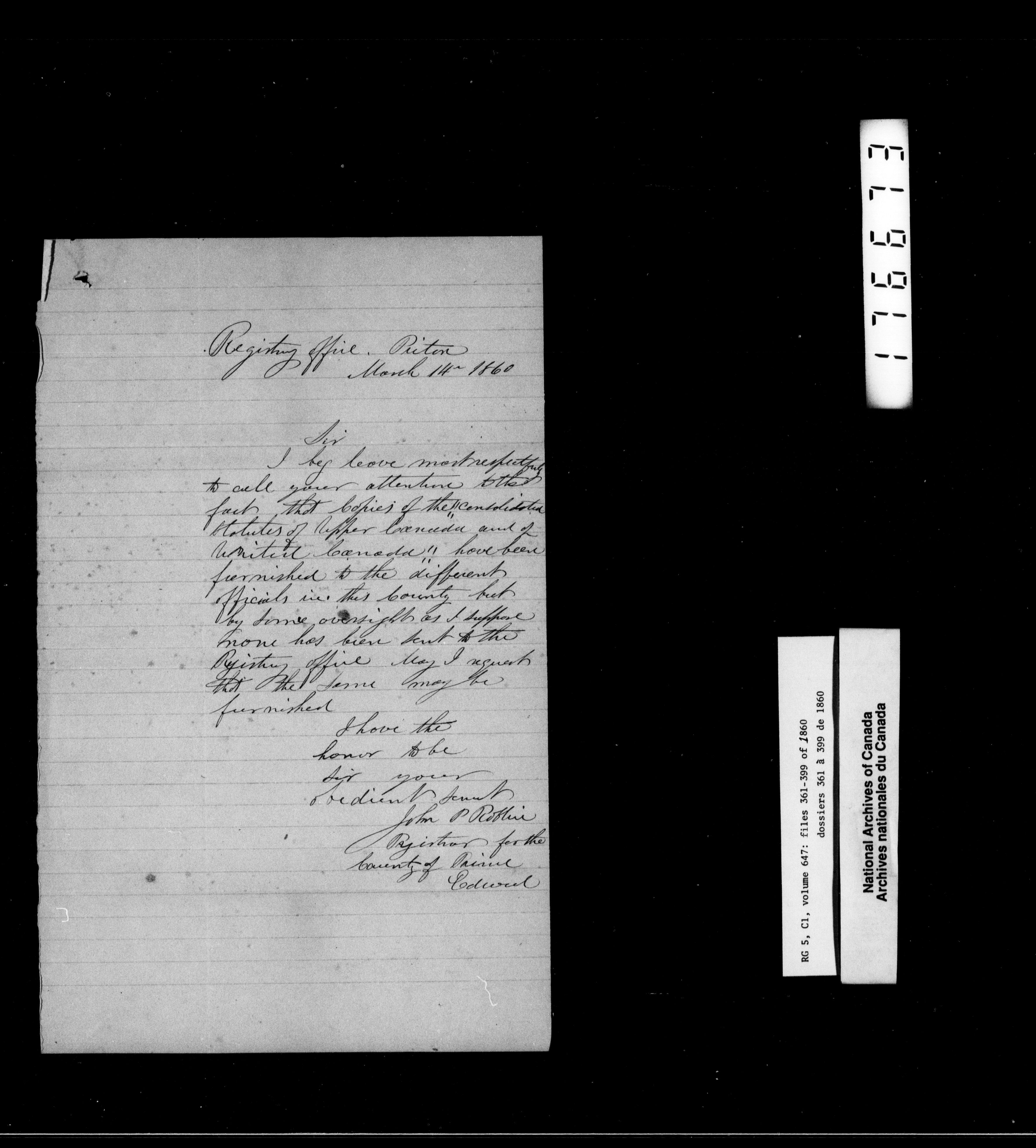 Canada West : Provincial Secretary, numbered correspondence files, 1844 to 1867 : H-2471