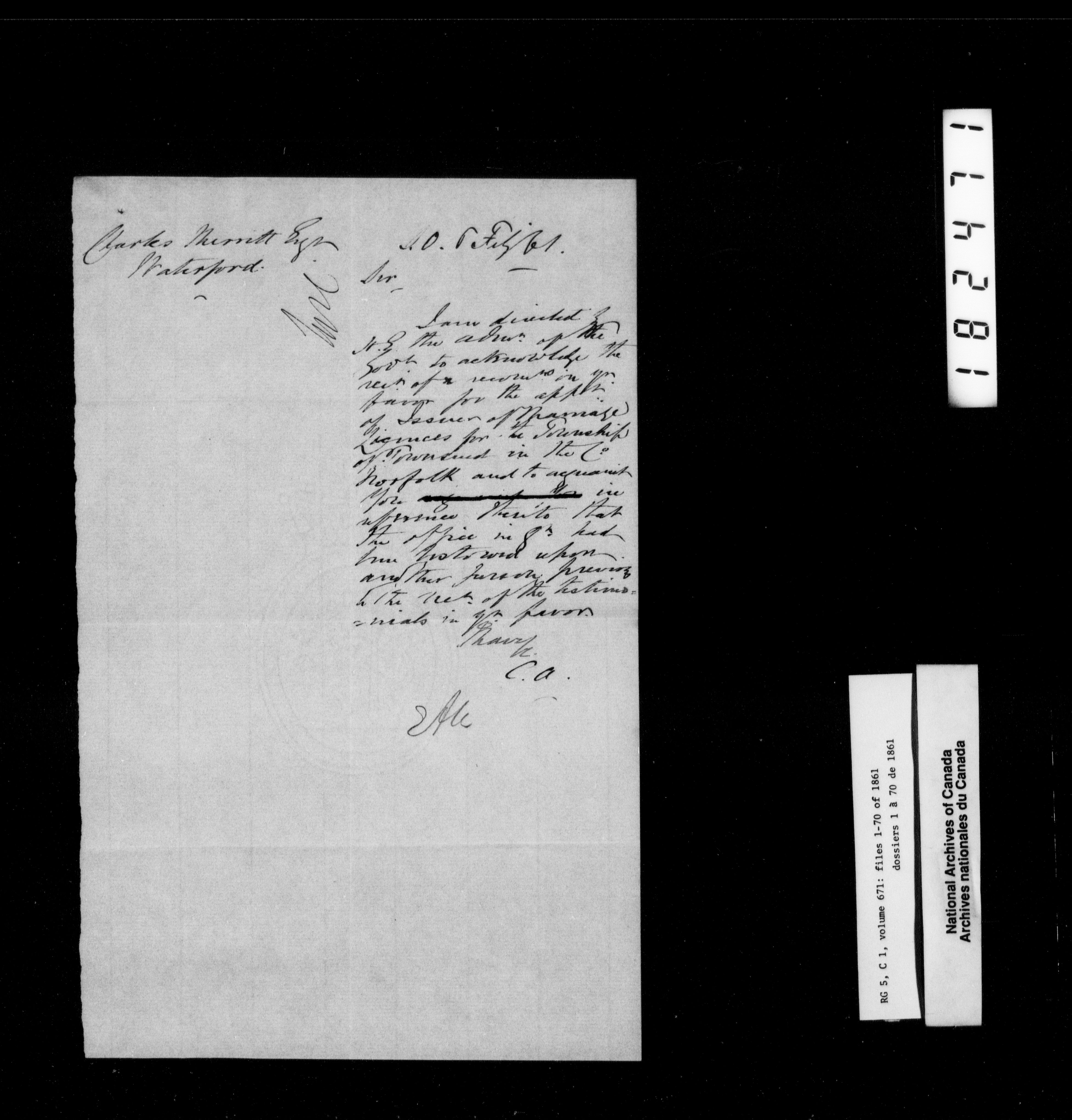 Canada West : Provincial Secretary, numbered correspondence files, 1844 to 1867 - 2476