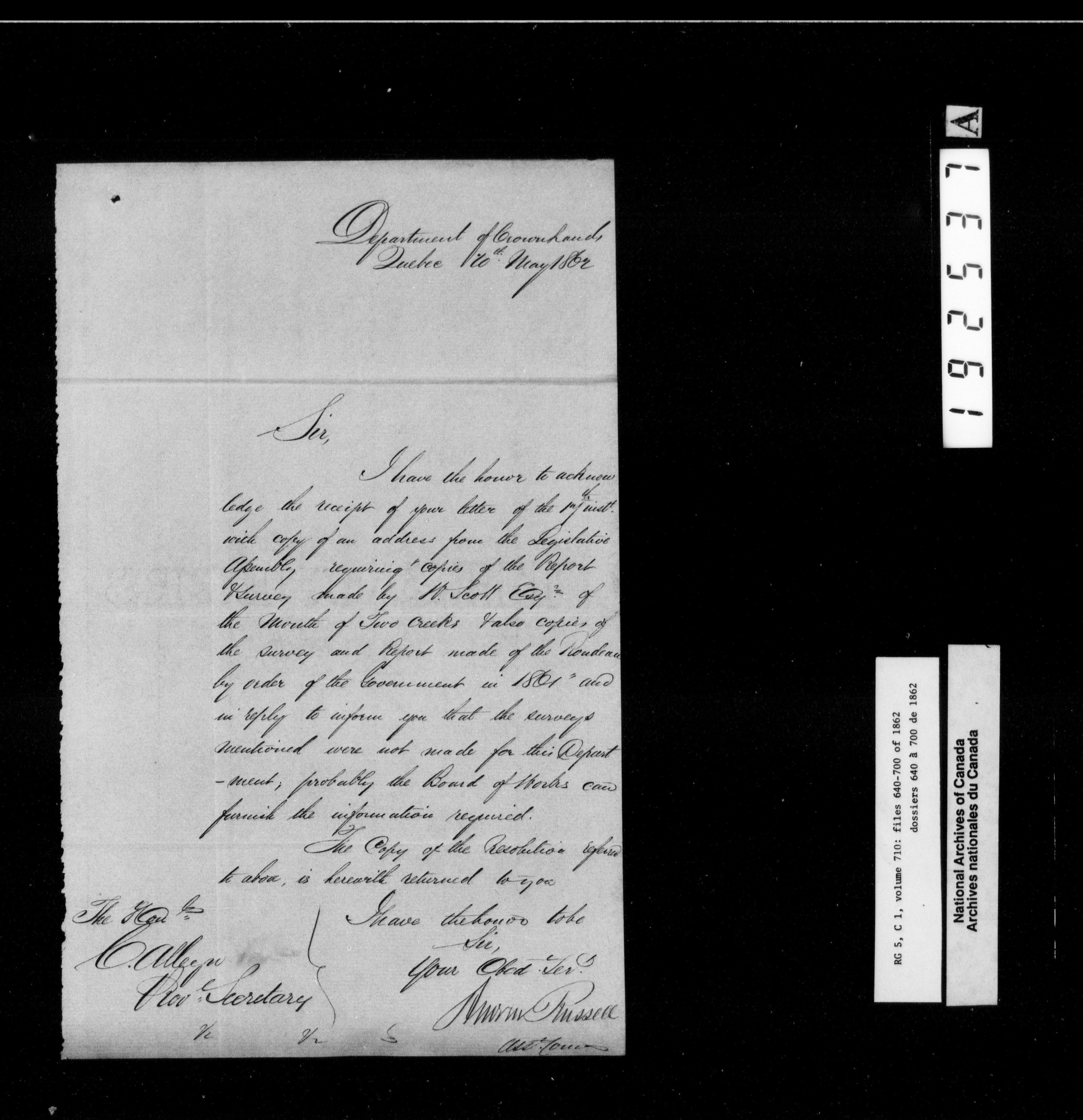 Canada West : Provincial Secretary, numbered correspondence files, 1844 to 1867 : H-2482