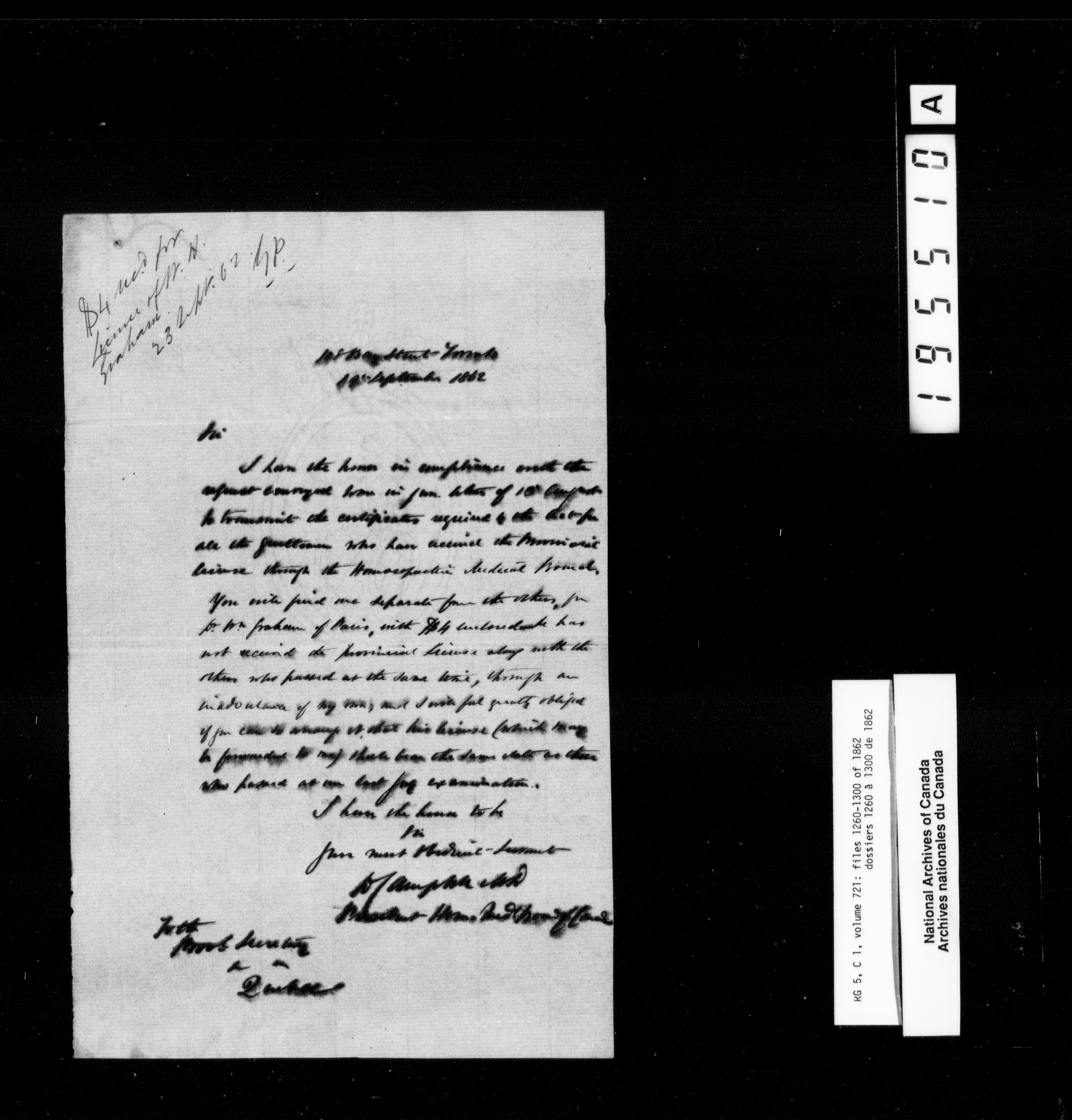 Canada West : Provincial Secretary, numbered correspondence files, 1844 to 1867 - 2485