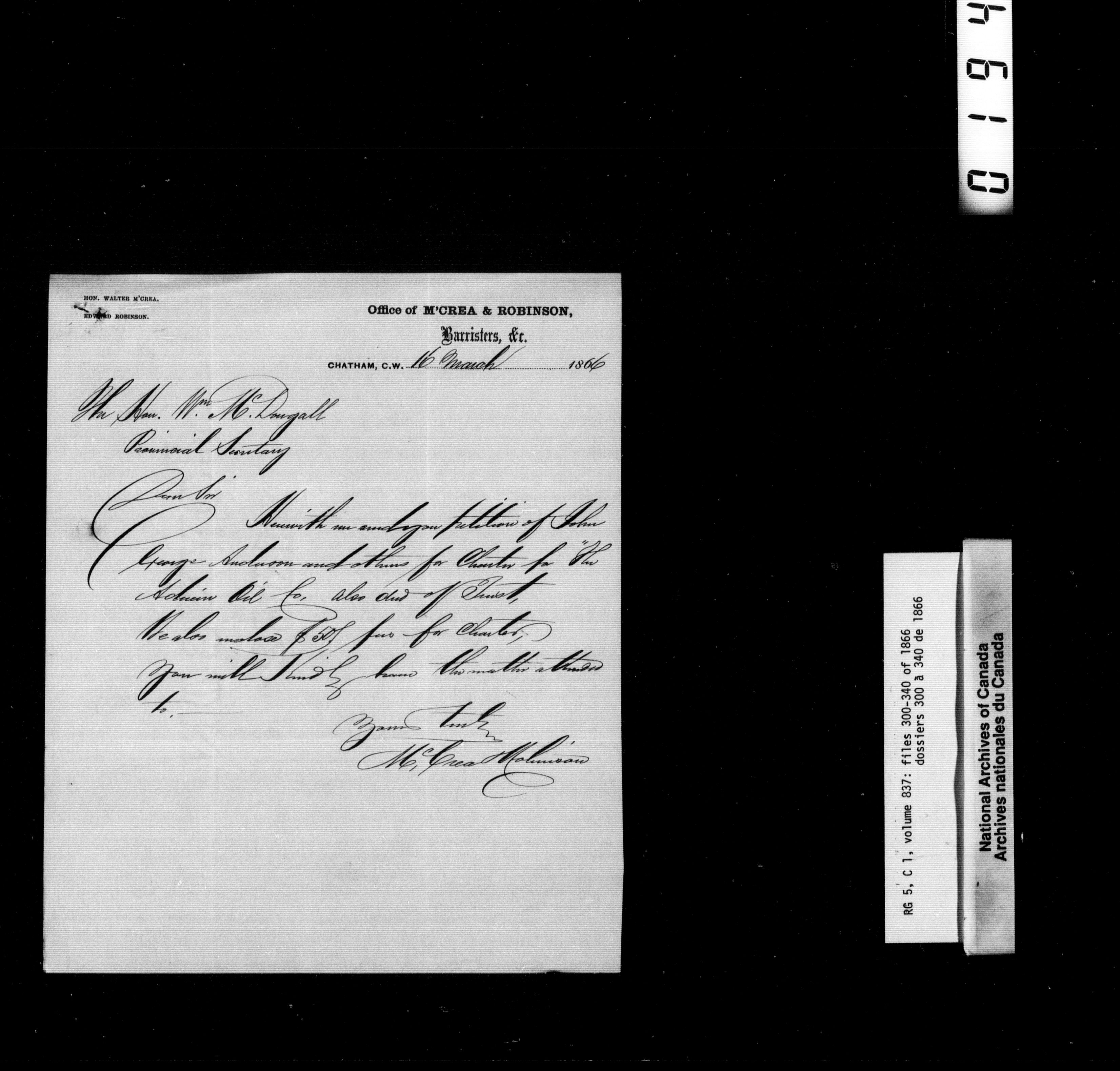 Canada West : Provincial Secretary, numbered correspondence files, 1844 to 1867 : H-2509