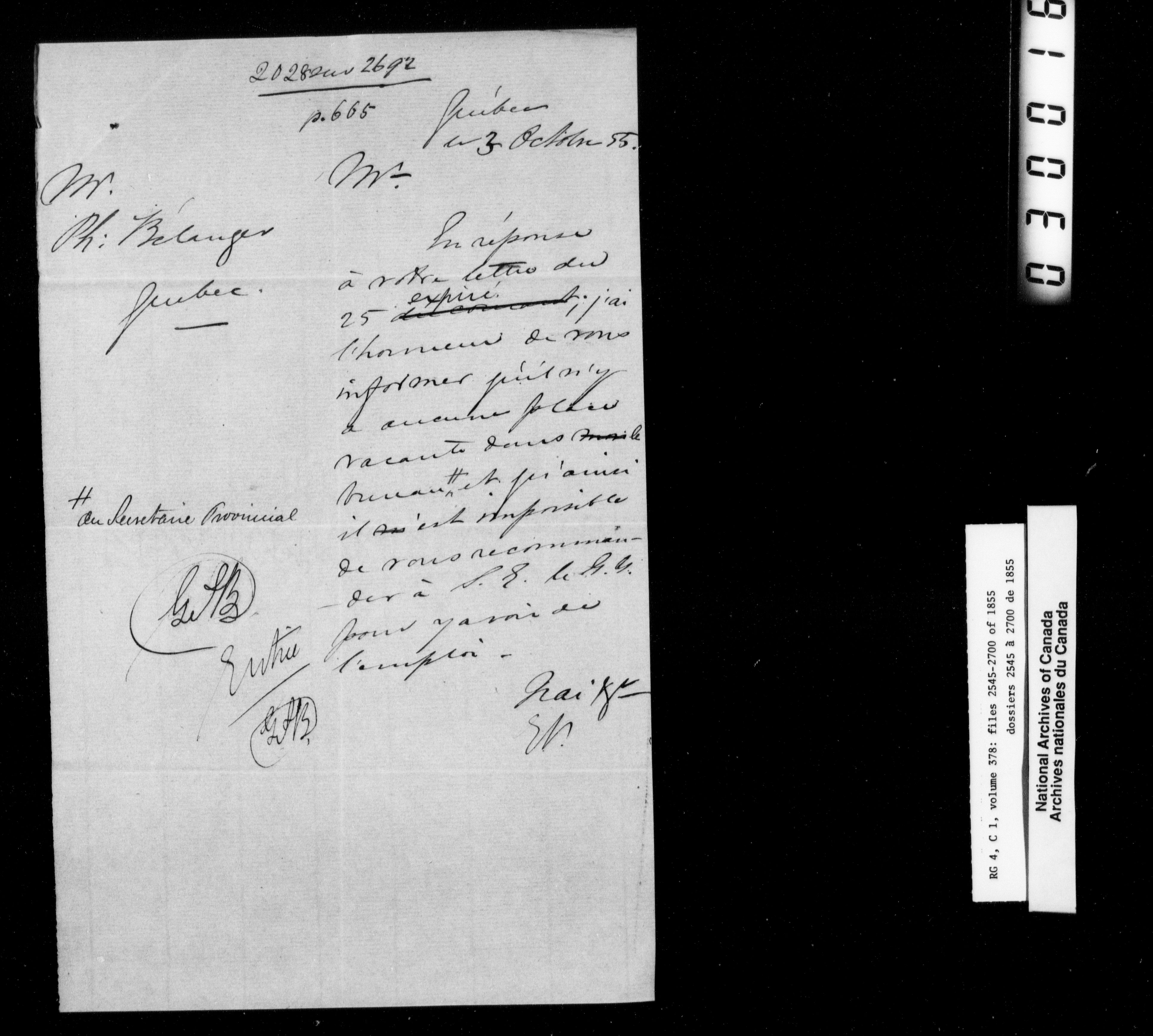 Canada East : Provincial Secretary numbered correspondence files, 1839-1867 - 2685