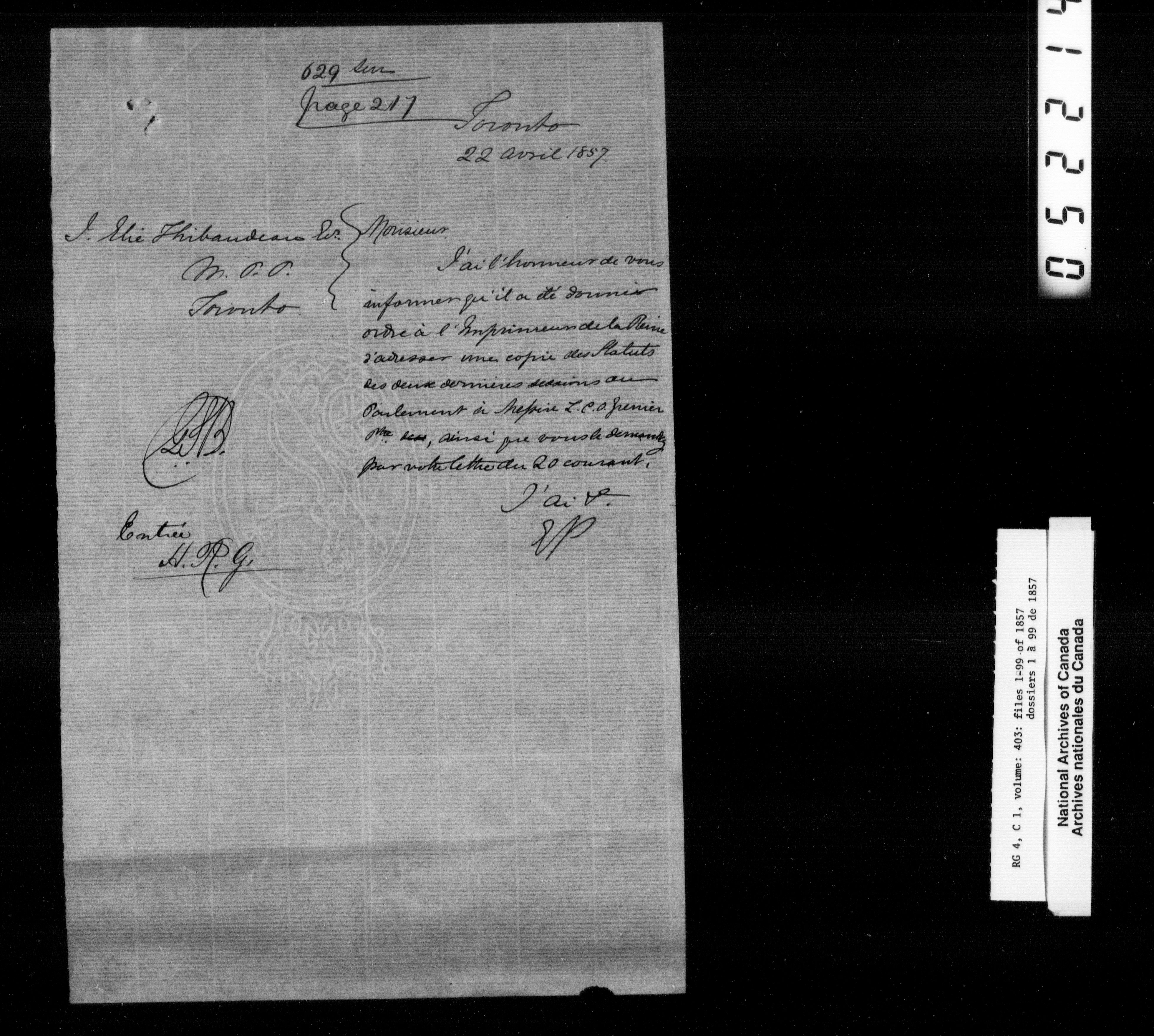Canada East : Provincial Secretary numbered correspondence files, 1839-1867 - 2701