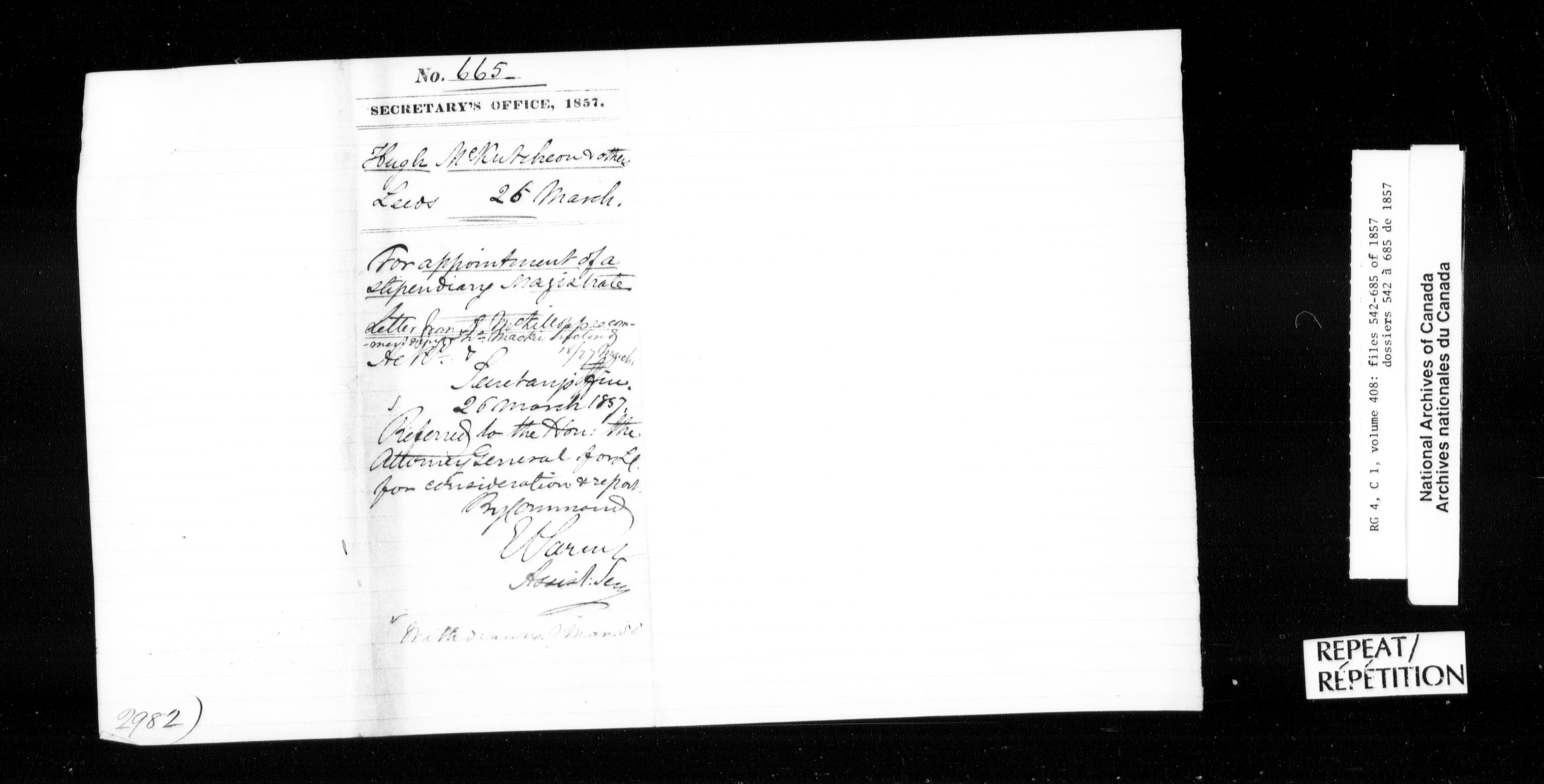 Canada East : Provincial Secretary numbered correspondence files, 1839-1867 - 2705