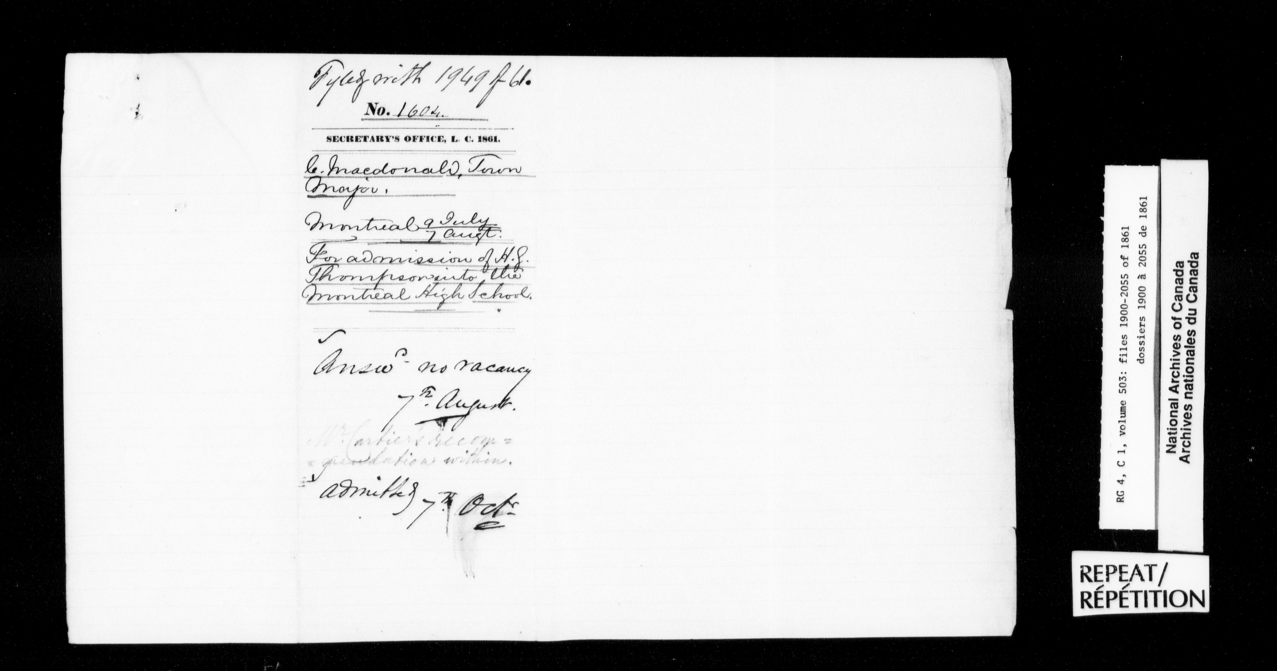Canada East : Provincial Secretary numbered correspondence files, 1839-1867 - 2752
