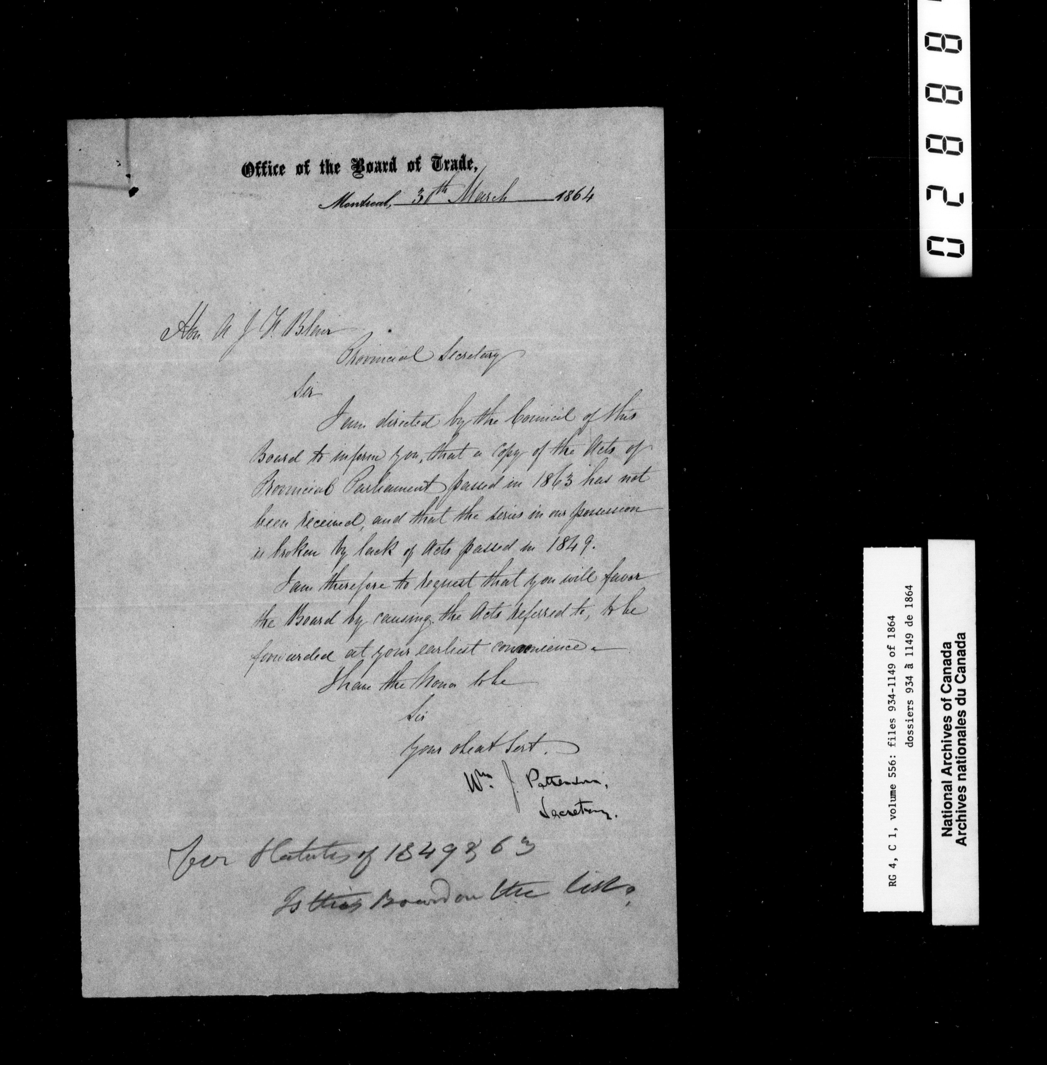 Canada East : Provincial Secretary numbered correspondence files, 1839-1867 - 2784