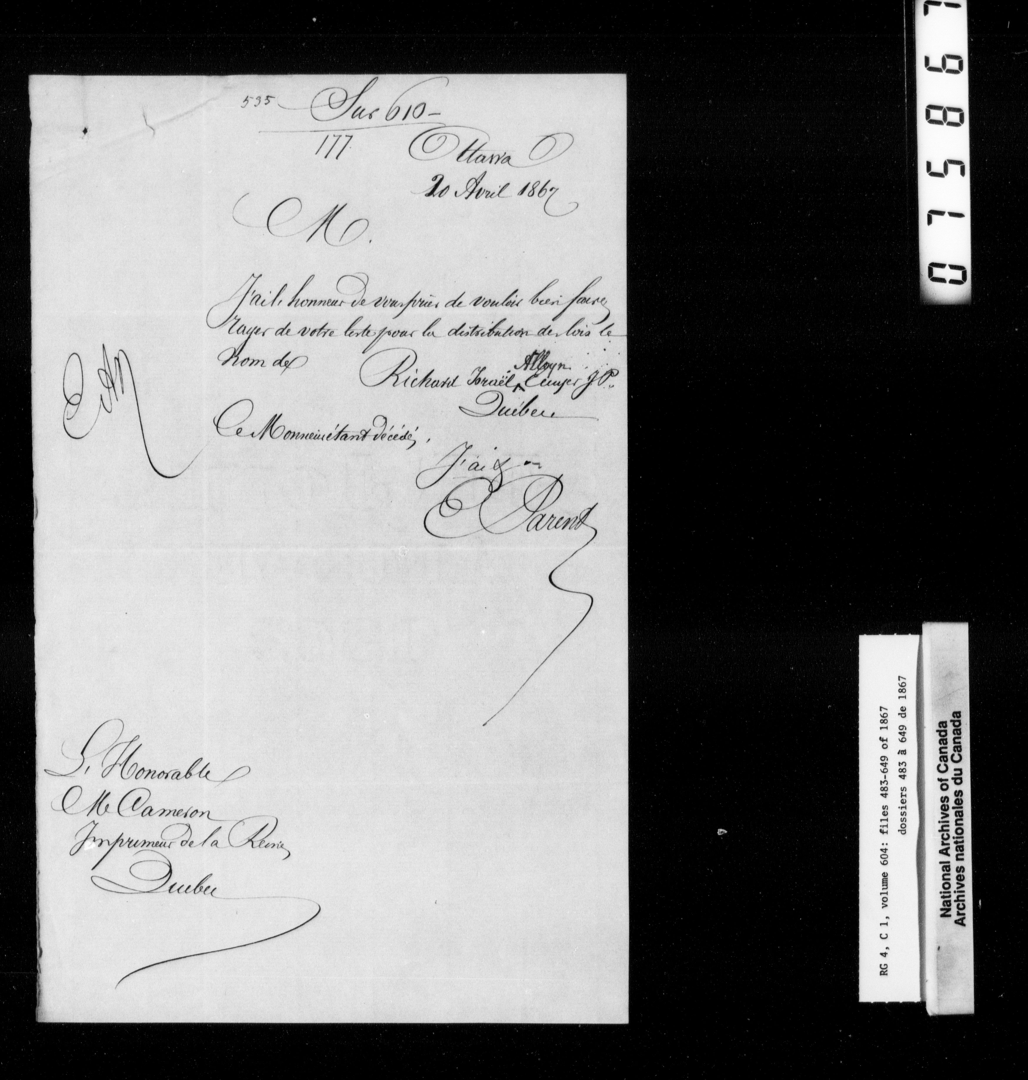 Canada East : Provincial Secretary numbered correspondence files, 1839-1867 - 2816