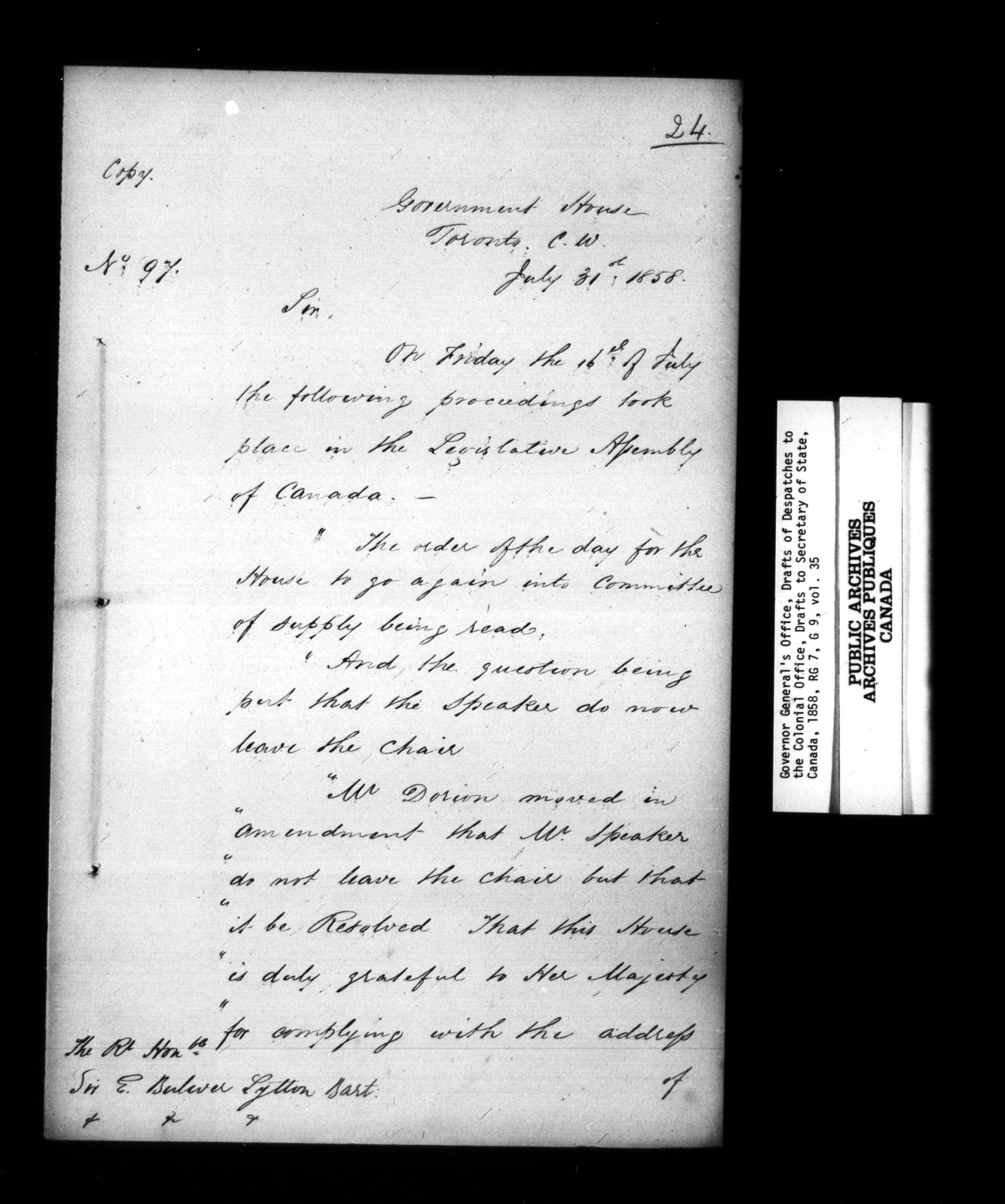 Governor General's Office, drafts of Despatches to the Secretary of State [Canada] - 952