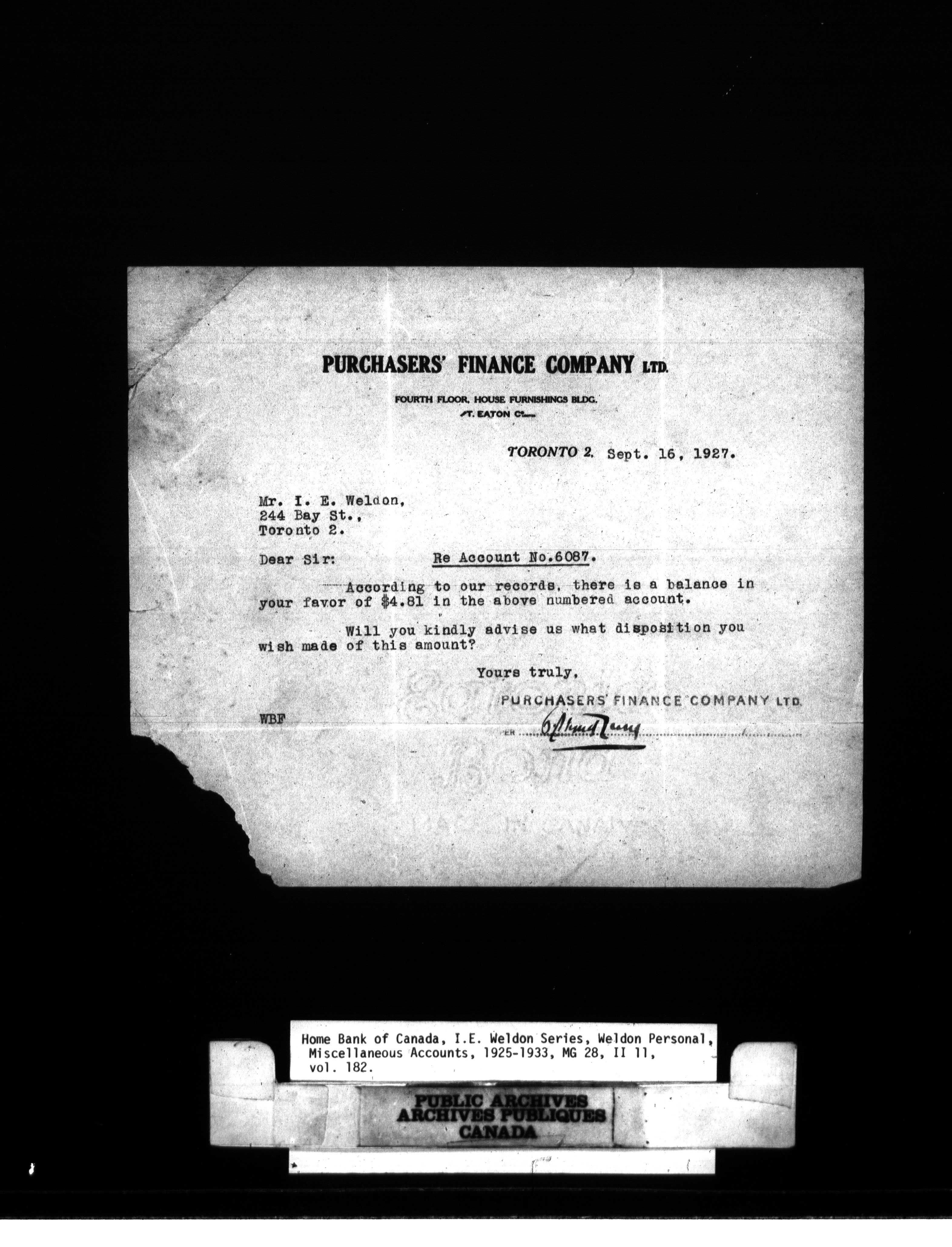 Home Bank of Canada : Correspondence and Weldon Personal - 979