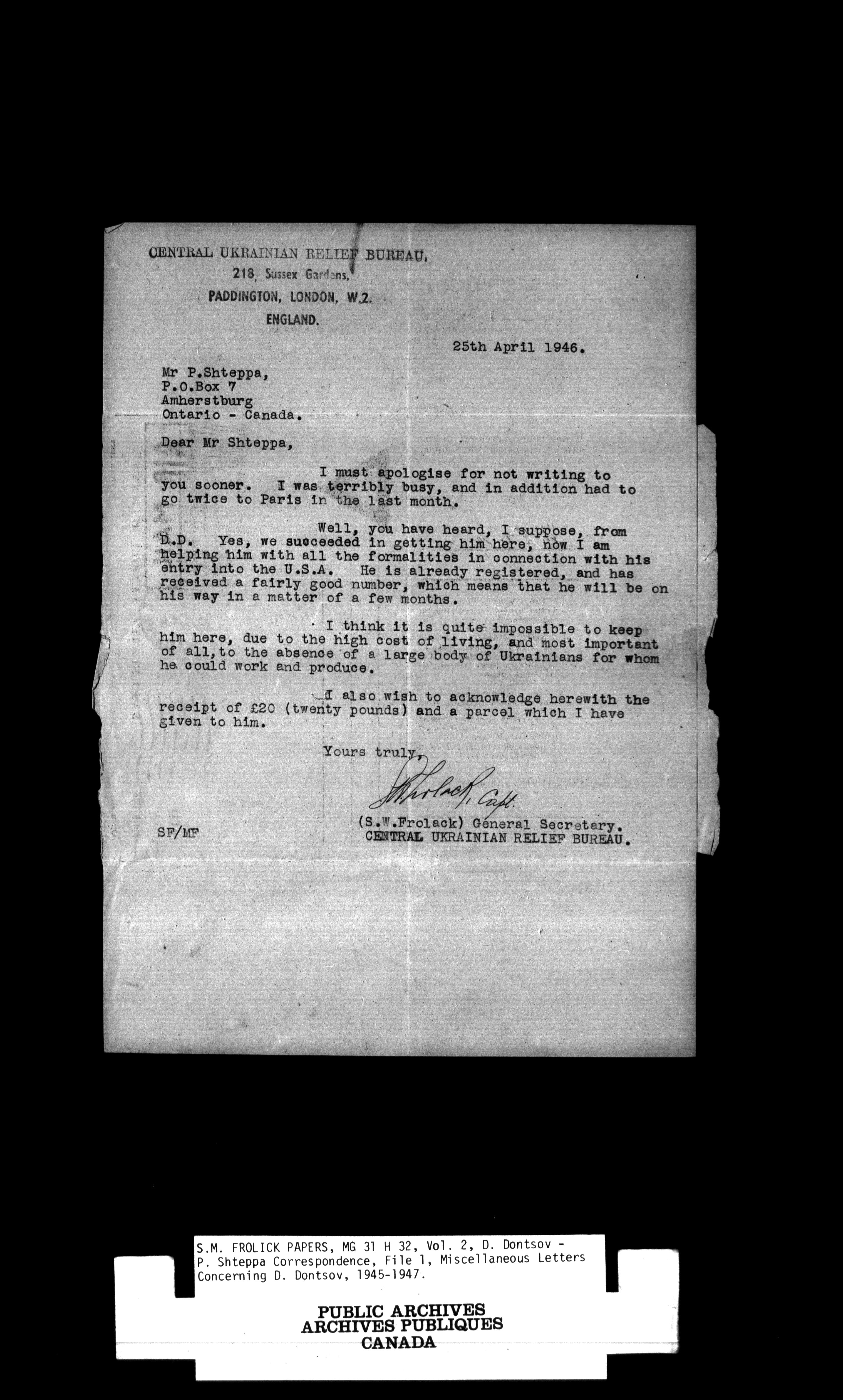 Stanley William Frolick fonds : Correspondence between Dmytro Dontsov and Paul Shteppa during the period of 1945-1972