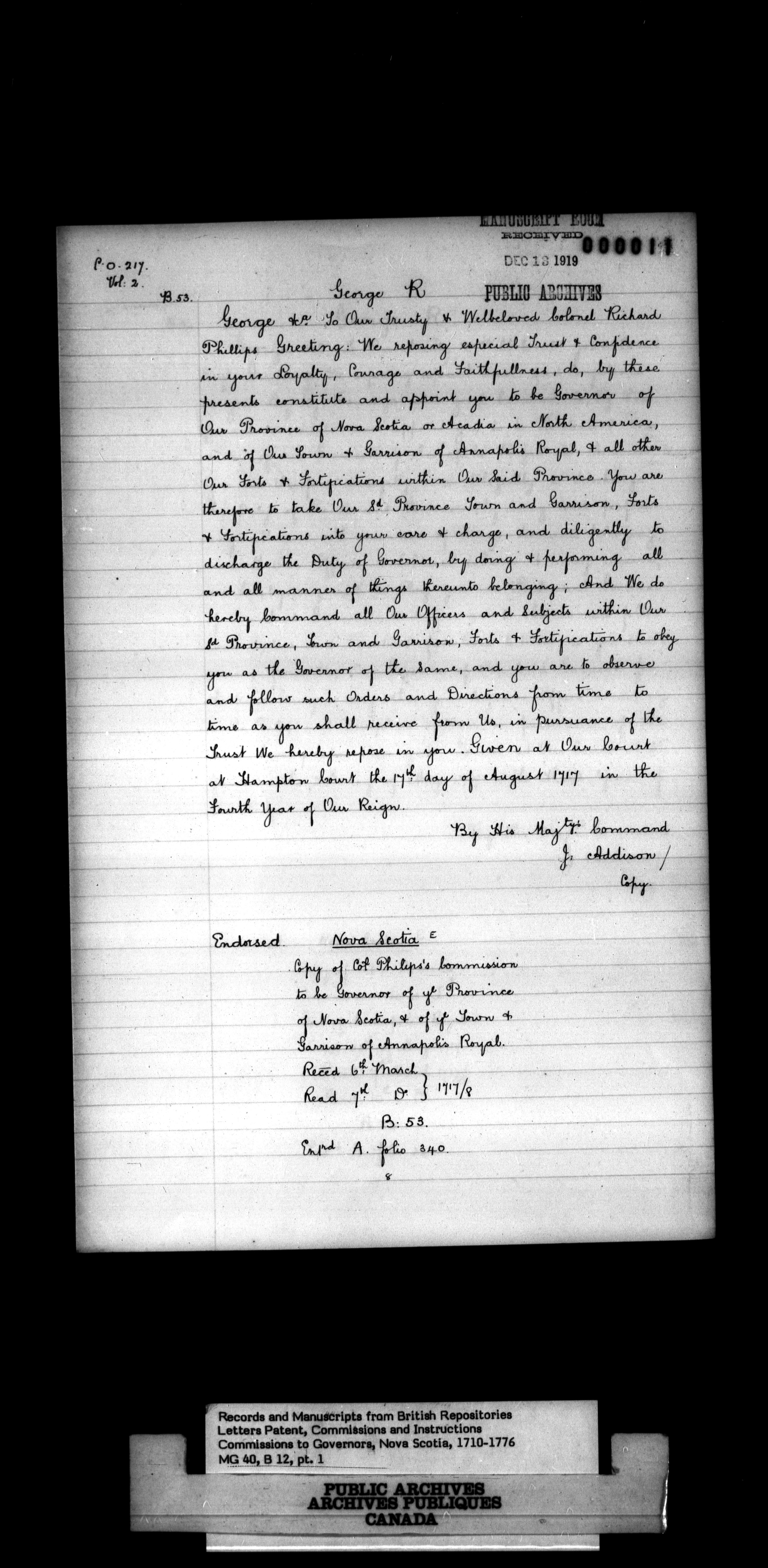 Nova Scotia and Cape Breton, Commissions and Instructions to Governors - 989