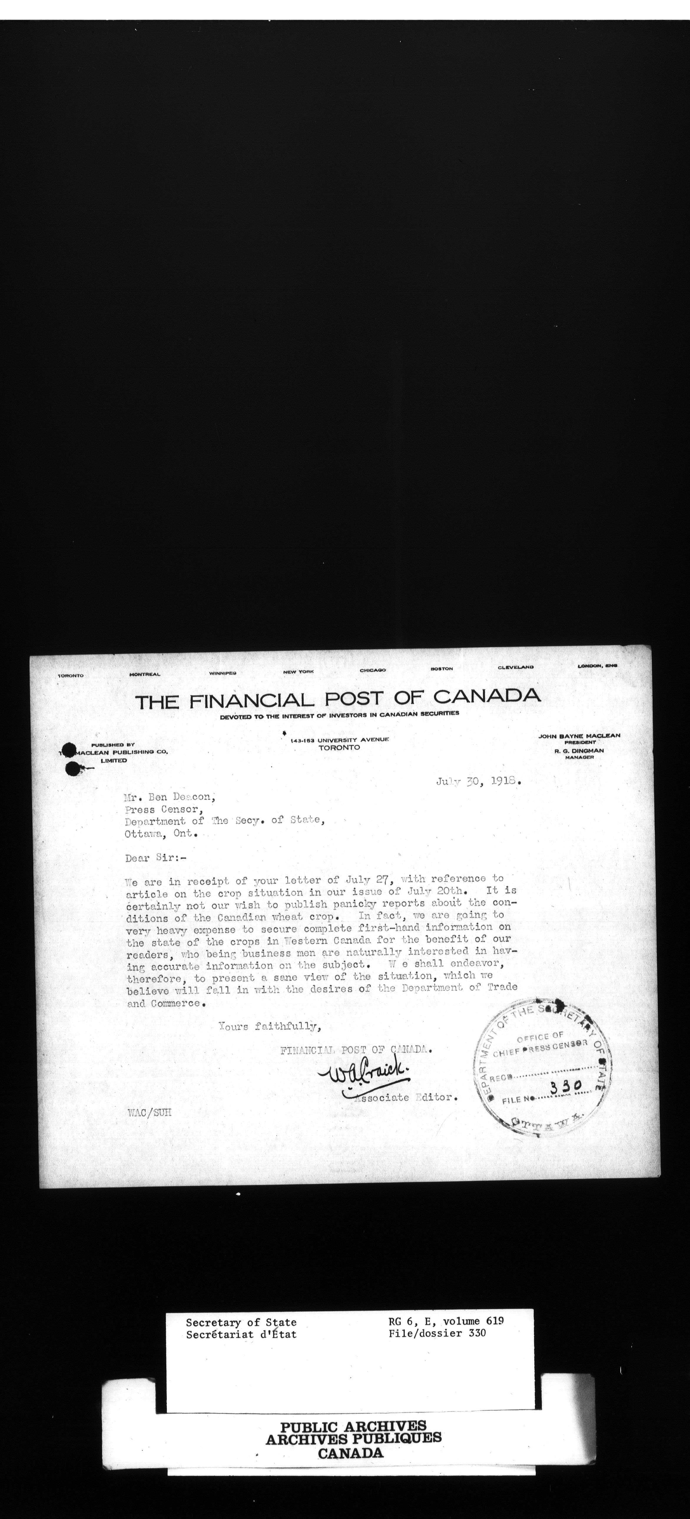 Secretary of State : Chief Press Censor, 1915-1920 - 100