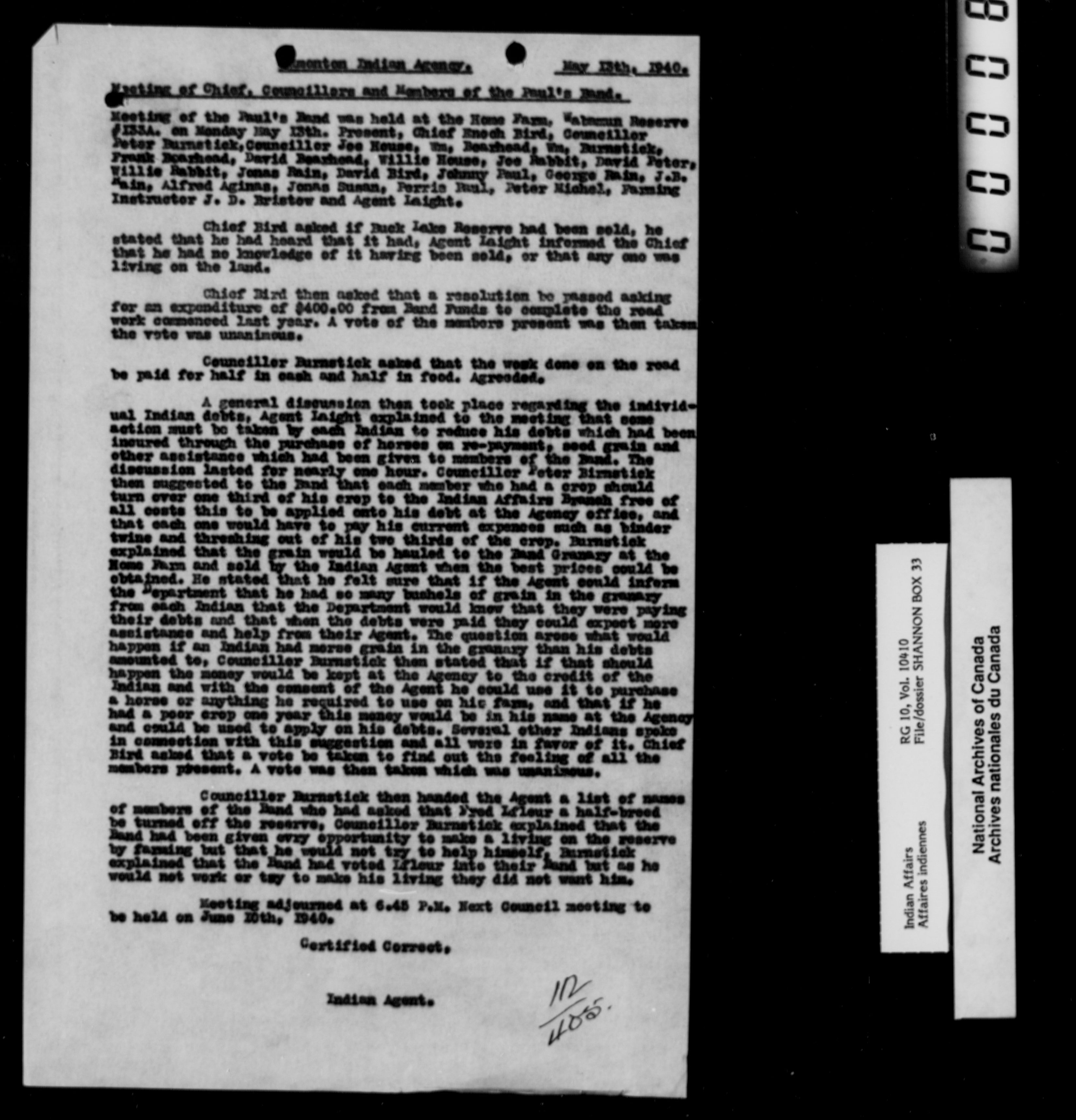 Department of Indian Affairs : Edmonton Agency (Volume 10410, file Shannon box 33 to vol. 10411, Shannon box 36) - 10068