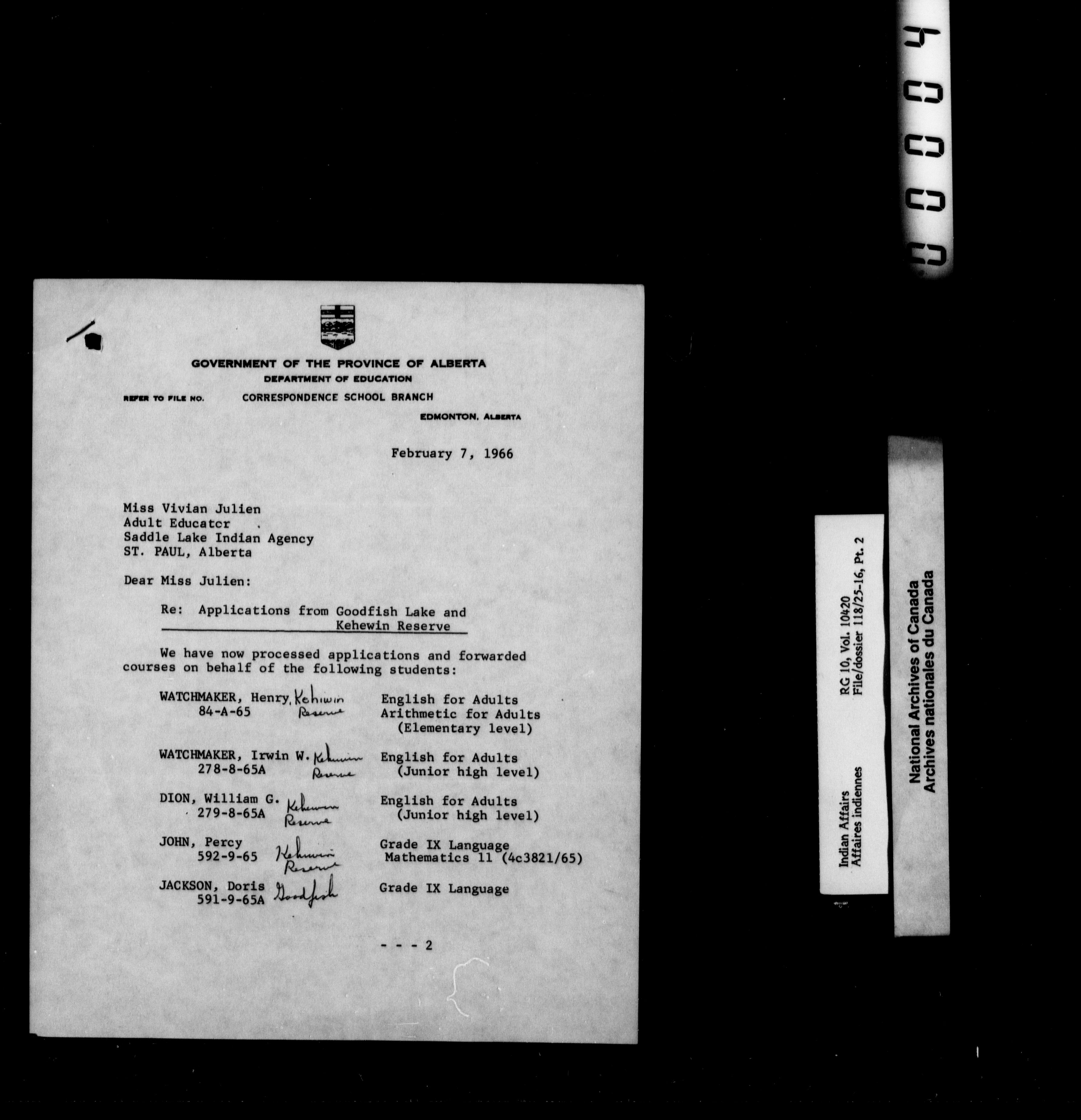 Department of Indian Affairs : Saddle Lake Agency : T-10074