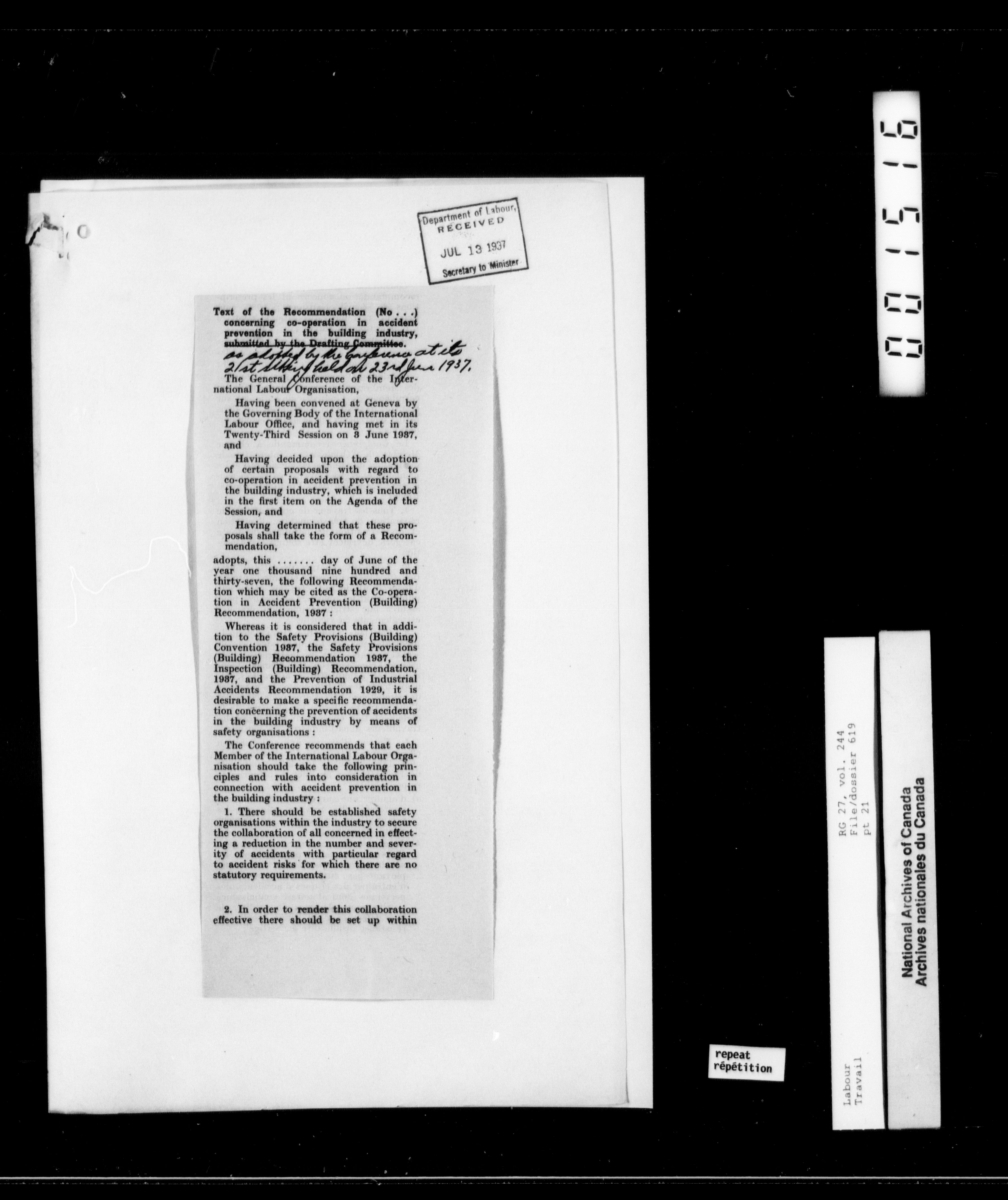 Department of Labour, Deputy Minister’s Office: Lacelle files : T-10173