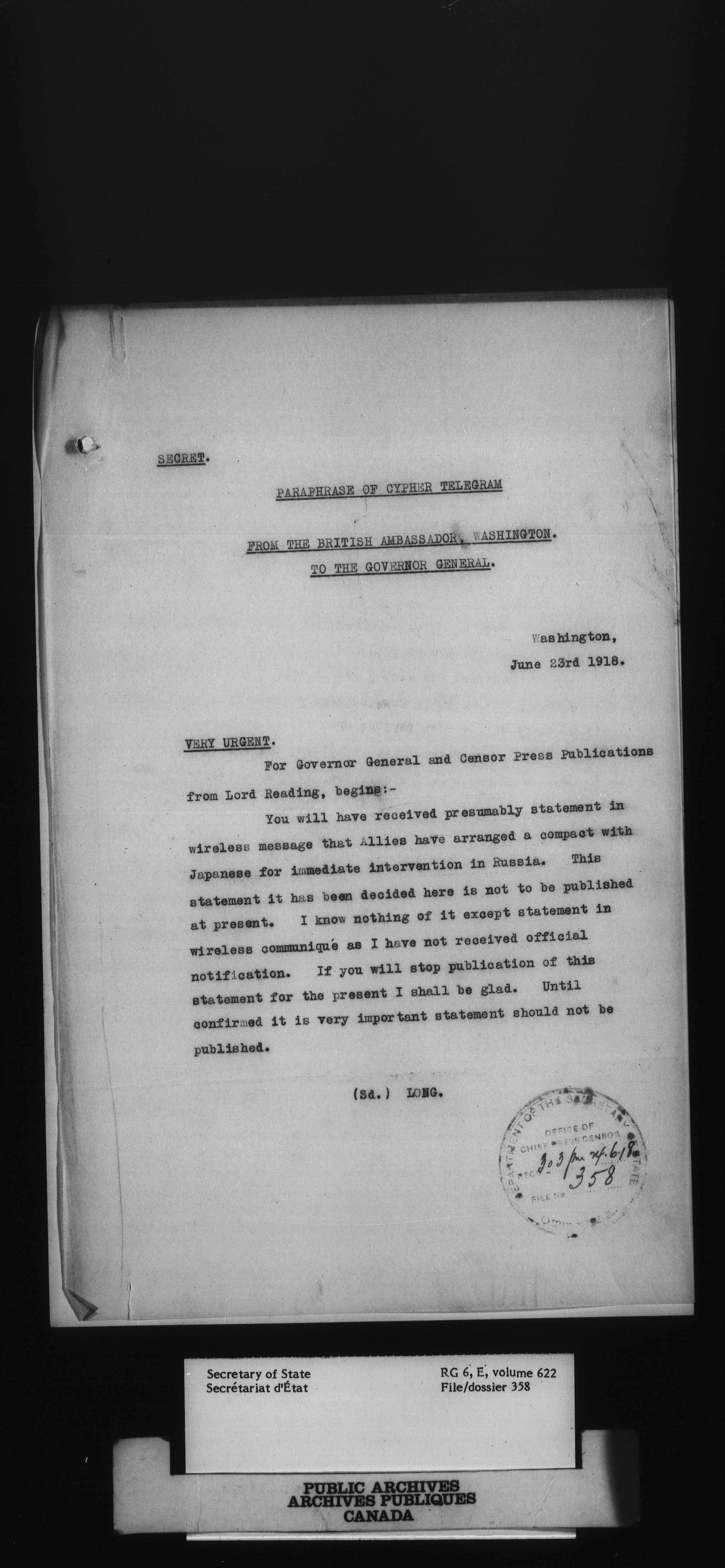Secretary of State : Chief Press Censor, 1915-1920 - 103