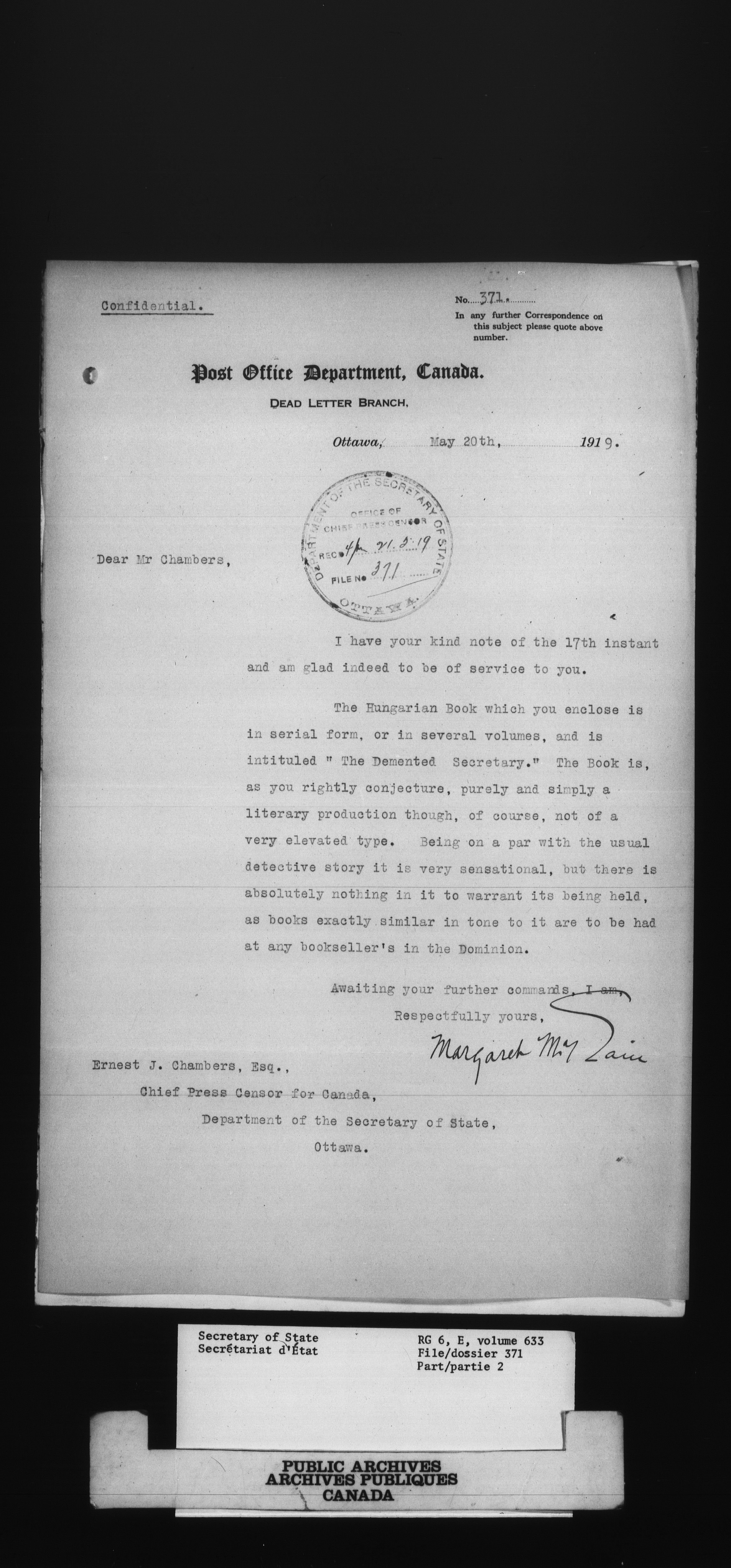 Secretary of State : Chief Press Censor, 1915-1920 - 109
