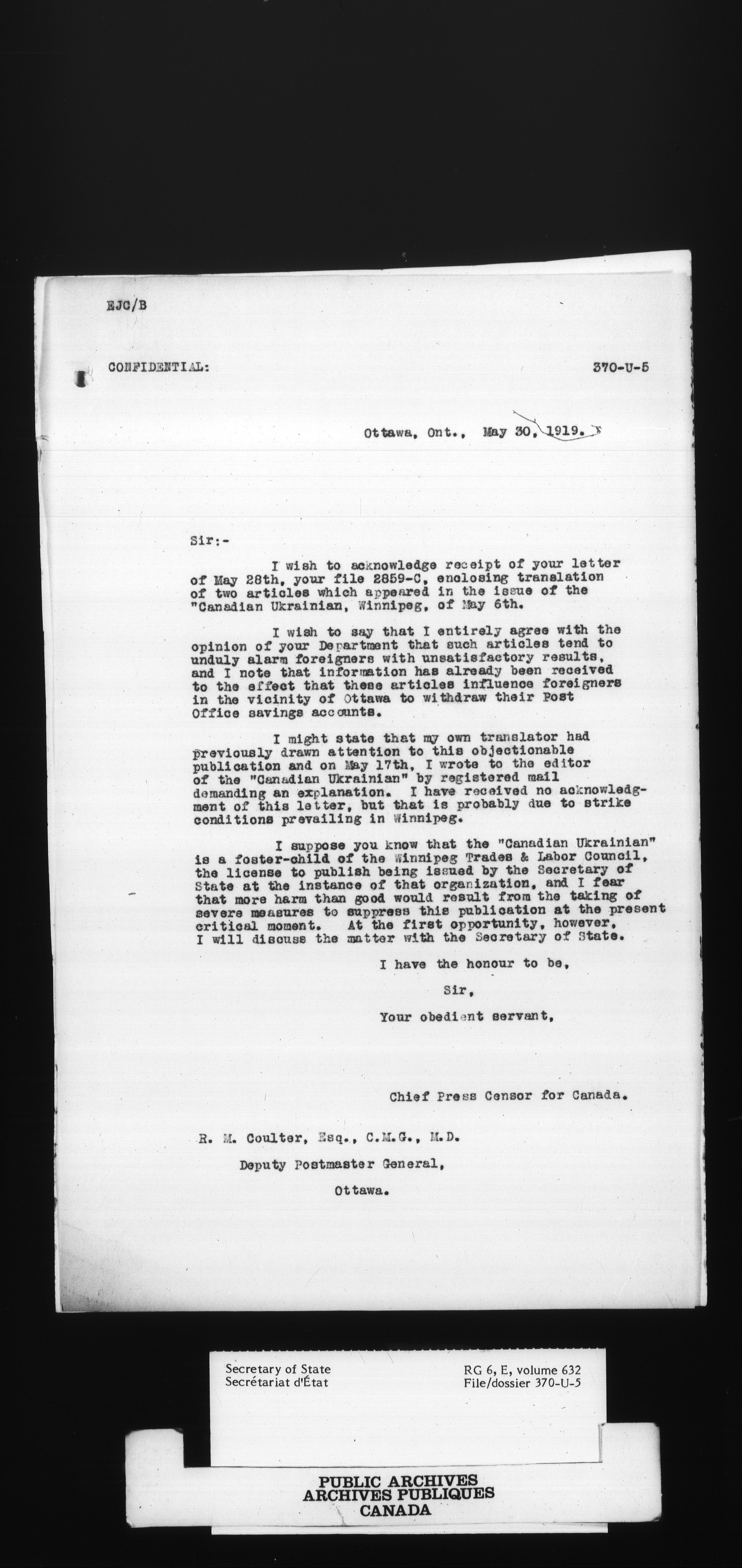 Secretary of State : Chief Press Censor, 1915-1920 - 109