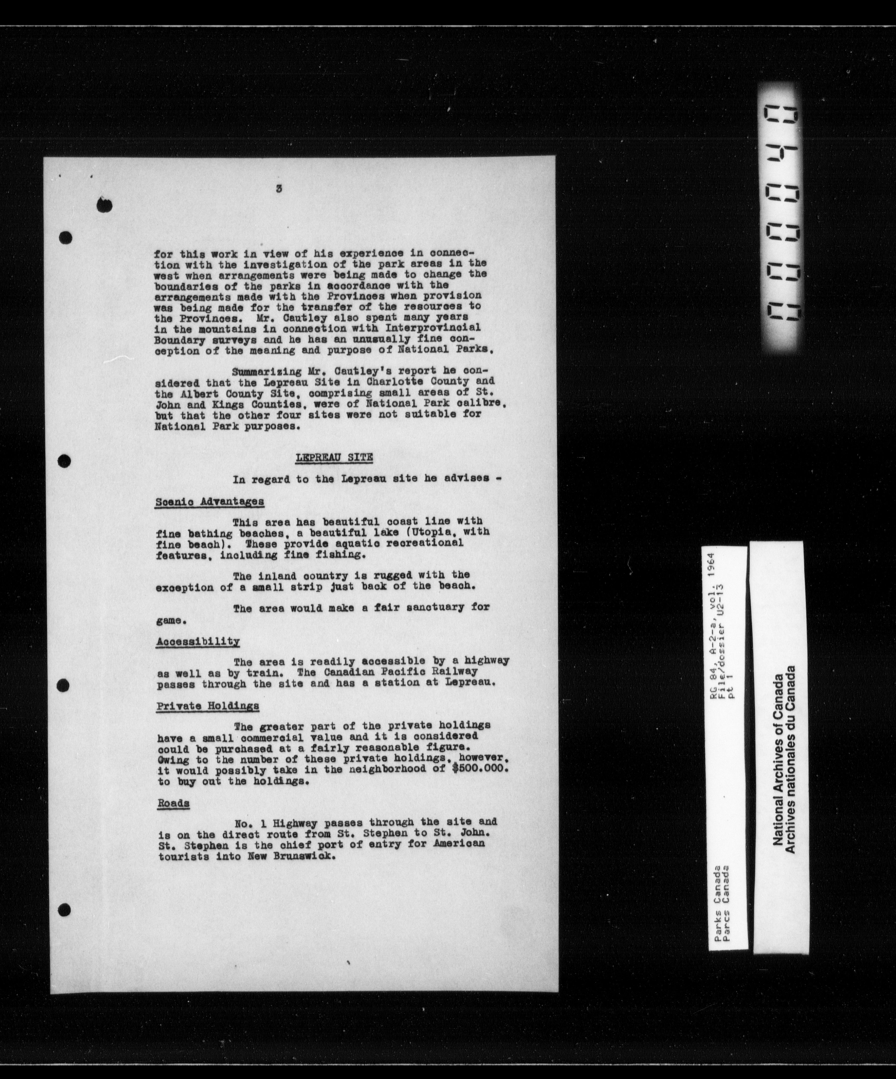 Department of Canadian Heritage, Canadian Parks Service : Park/subject classification system - 11101