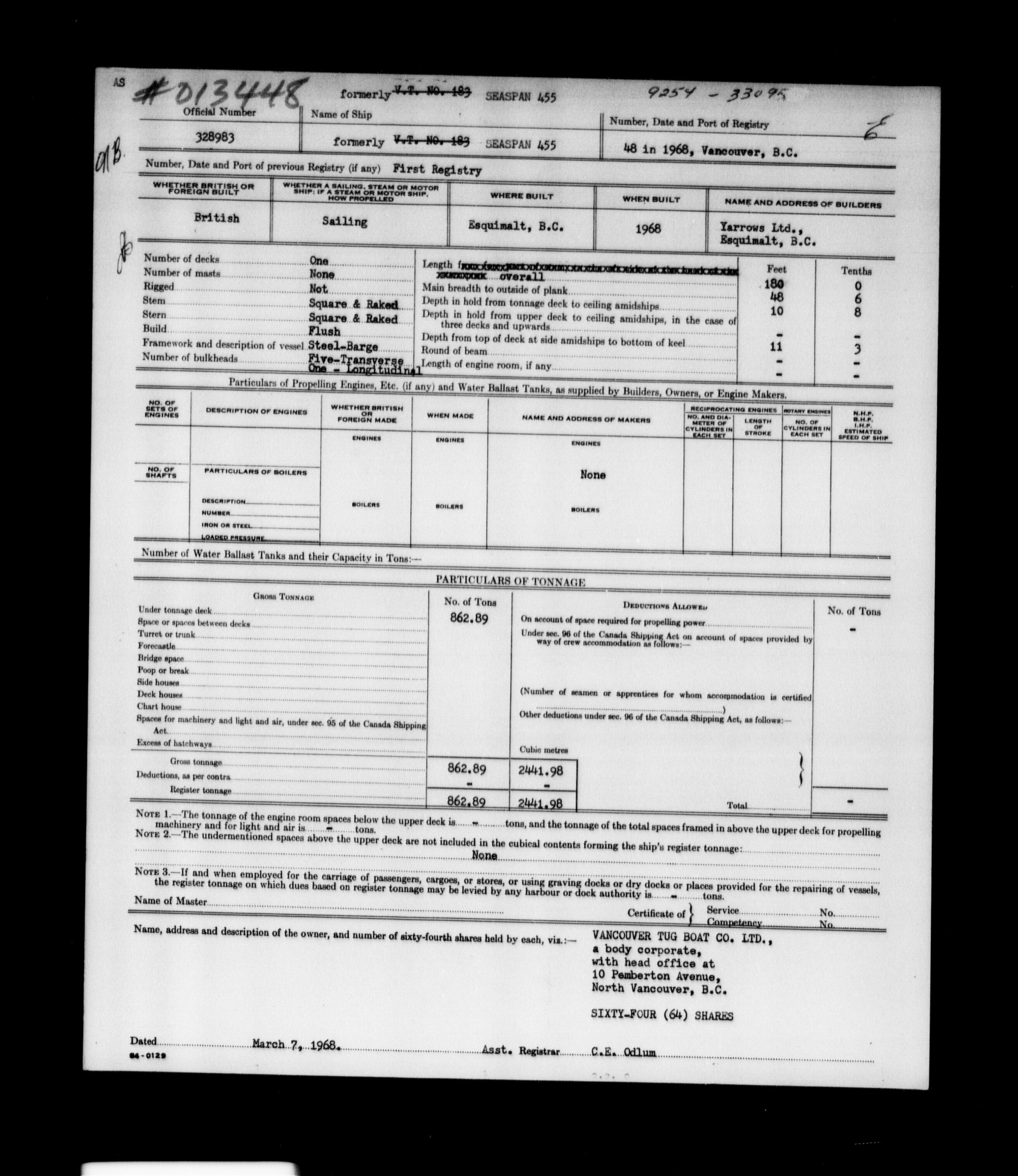Department of Transport : Registers and ledgers cards of ships closed-out (1904-1983) - 11596