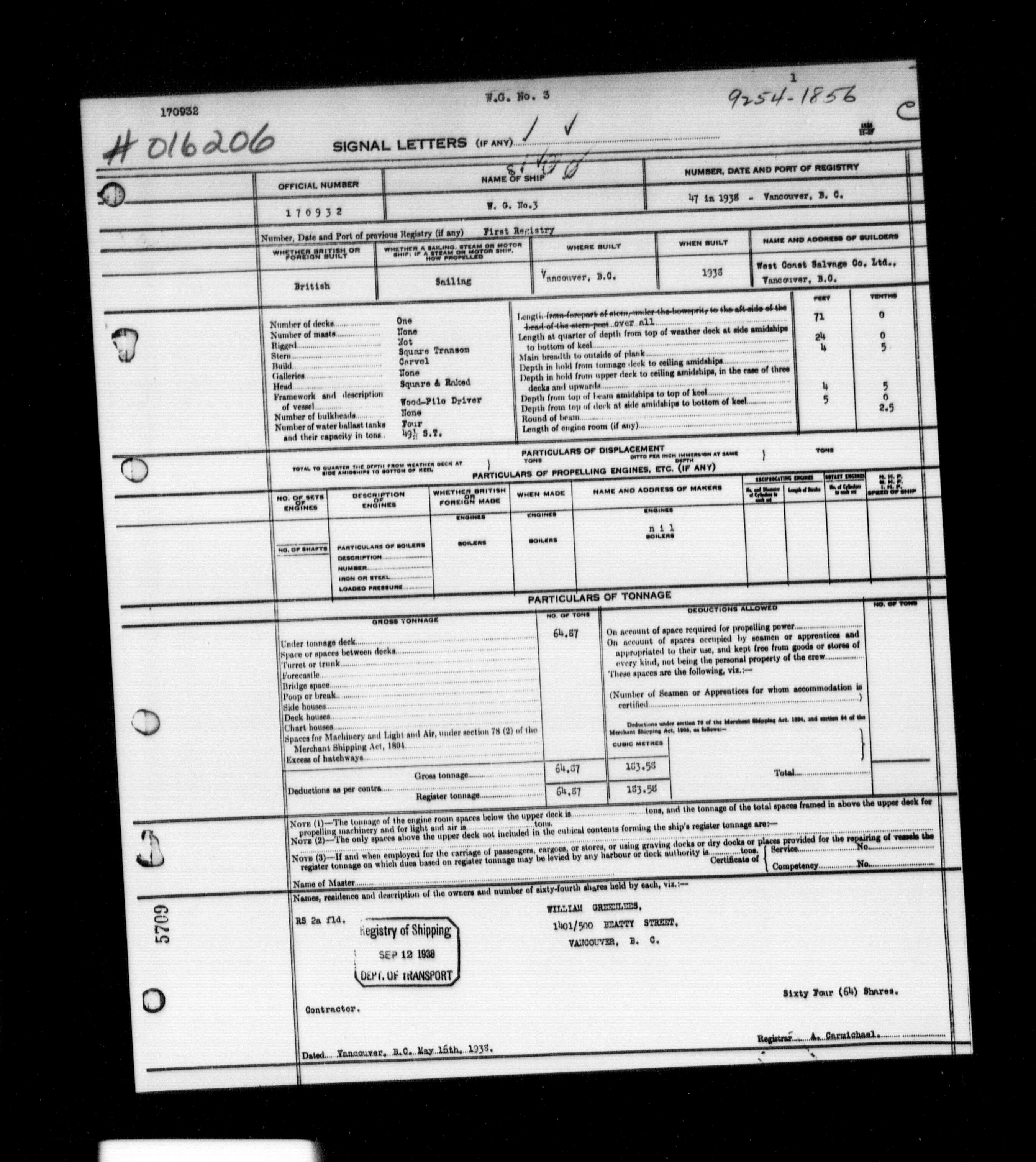 Department of Transport : Registers and ledgers cards of ships closed-out (1904-1983) - 11599