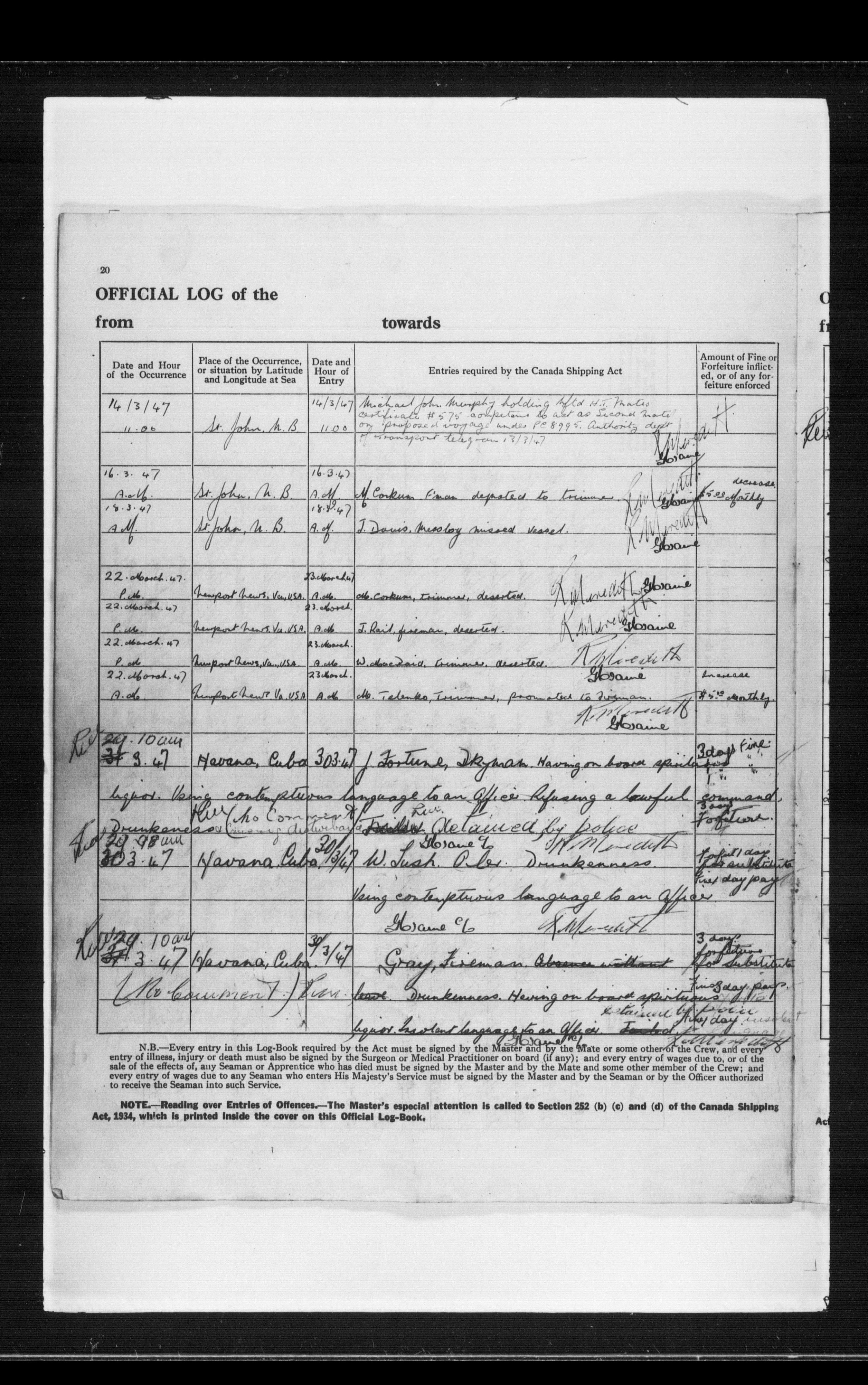 Canadian Marine Transportation Administration, Canadian Coast Guard, Ship Safety Branch, Central Registry of Seamen, Articles of Agreement and Ships' Logs : T-11807