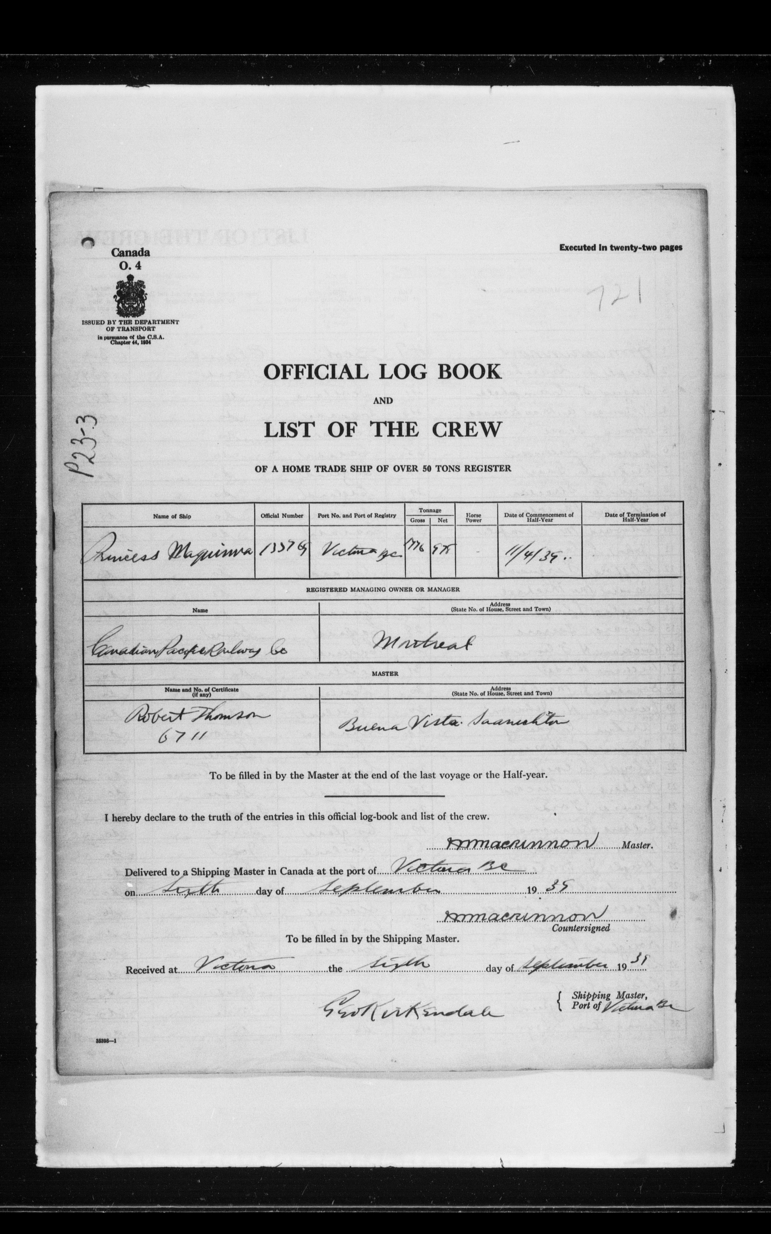 Canadian Marine Transportation Administration, Canadian Coast Guard, Ship Safety Branch, Central Registry of Seamen, Articles of Agreement and Ships' Logs - 11808