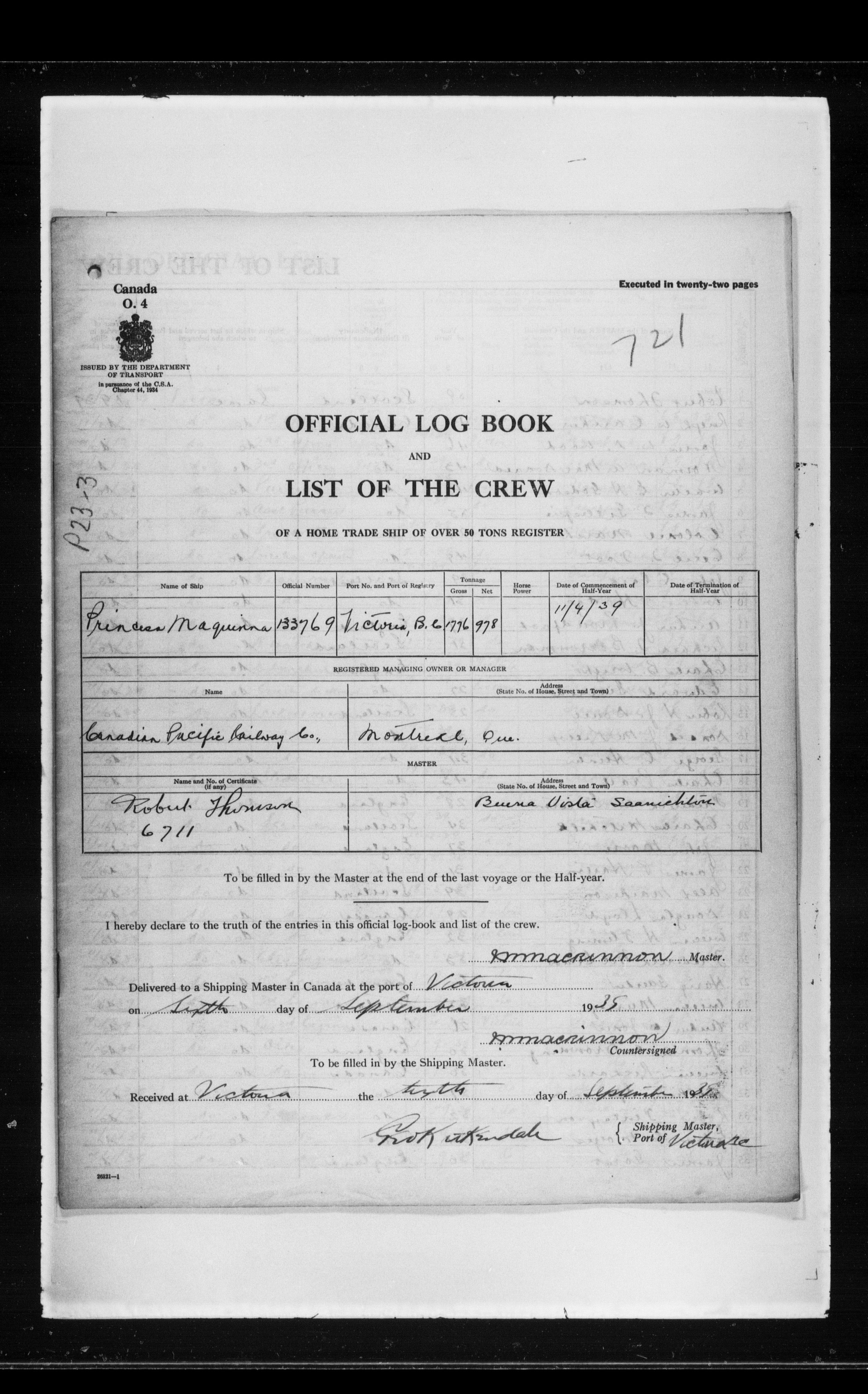 Canadian Marine Transportation Administration, Canadian Coast Guard, Ship Safety Branch, Central Registry of Seamen, Articles of Agreement and Ships' Logs - 11808