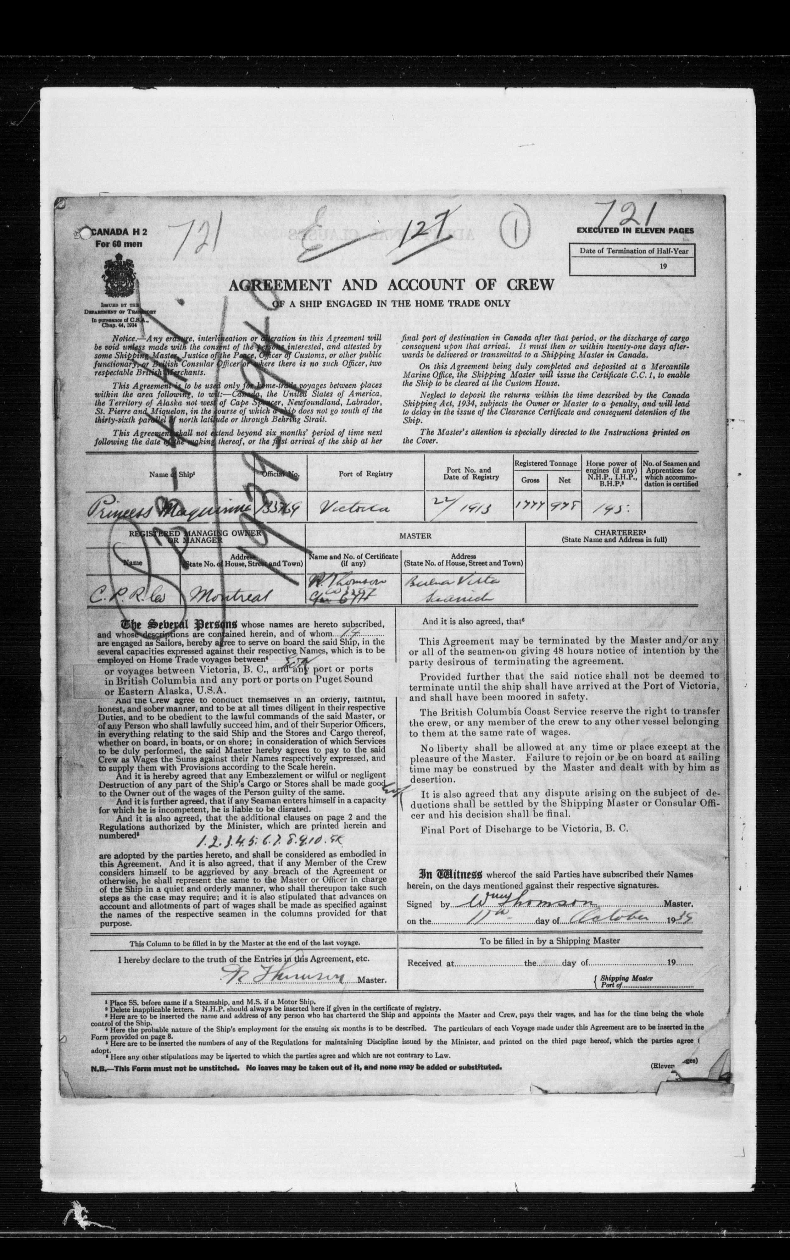 Canadian Marine Transportation Administration, Canadian Coast Guard, Ship Safety Branch, Central Registry of Seamen, Articles of Agreement and Ships' Logs - 11808