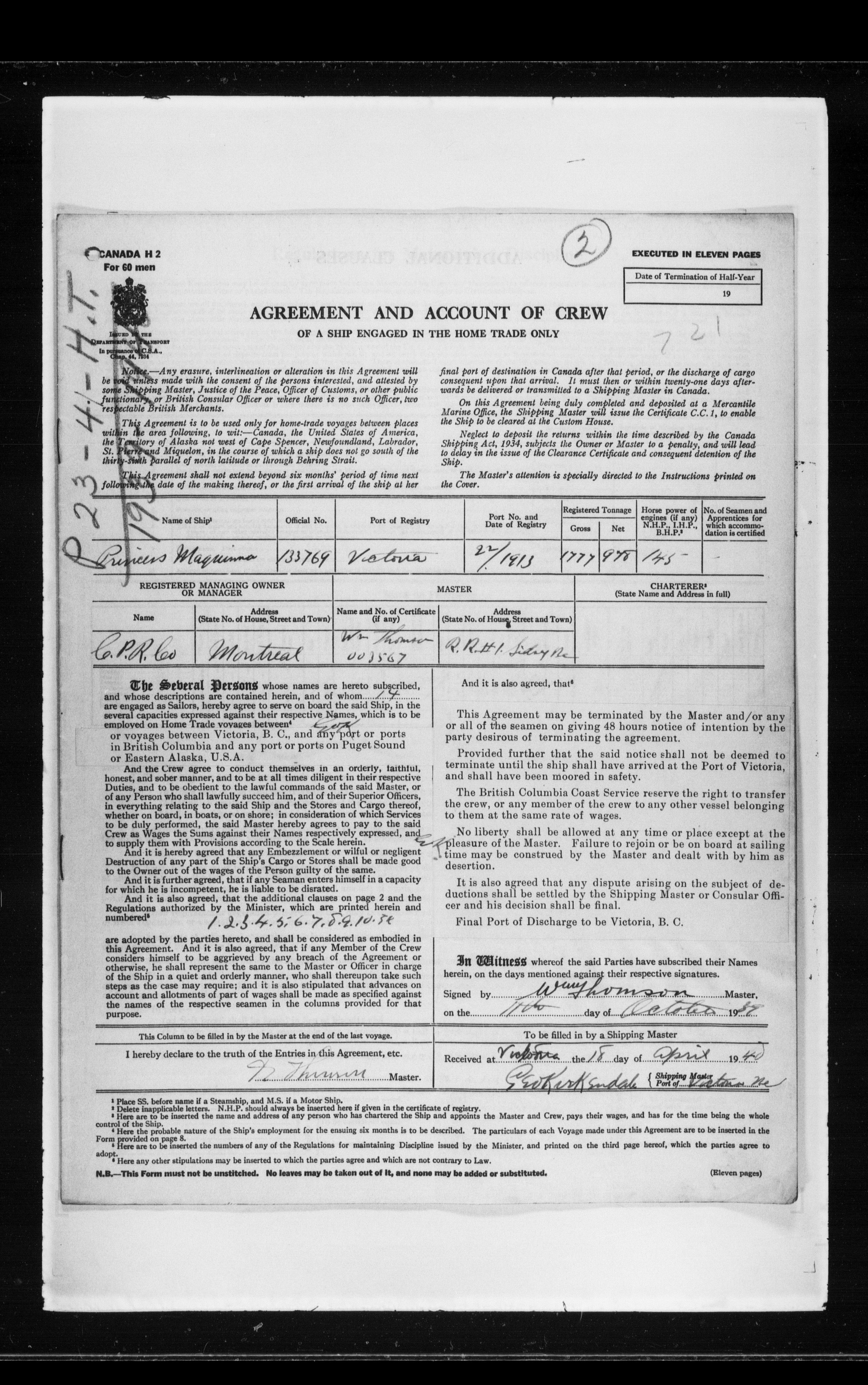Canadian Marine Transportation Administration, Canadian Coast Guard, Ship Safety Branch, Central Registry of Seamen, Articles of Agreement and Ships' Logs - 11808