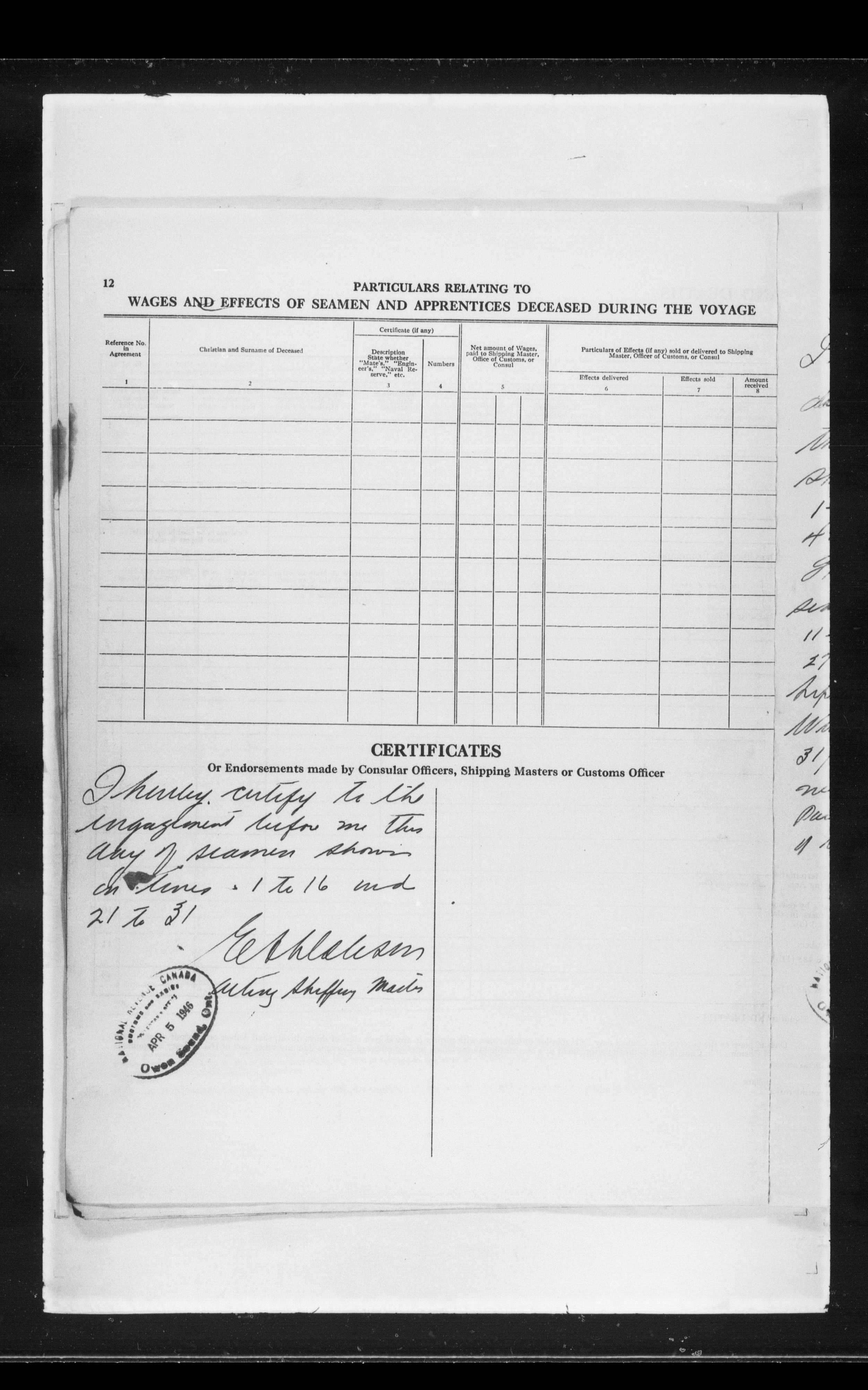 Canadian Marine Transportation Administration, Canadian Coast Guard, Ship Safety Branch, Central Registry of Seamen, Articles of Agreement and Ships' Logs : T-11809