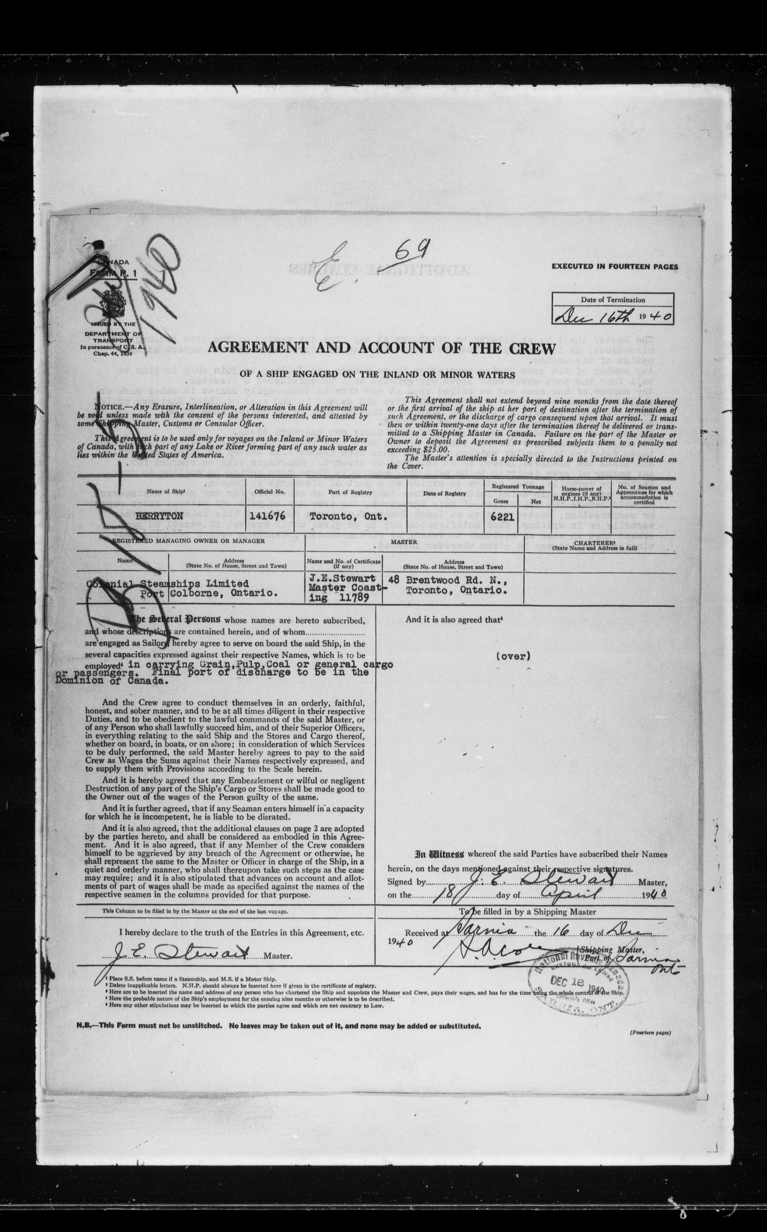 Canadian Marine Transportation Administration, Canadian Coast Guard, Ship Safety Branch, Central Registry of Seamen, Articles of Agreement and Ships' Logs - 11811