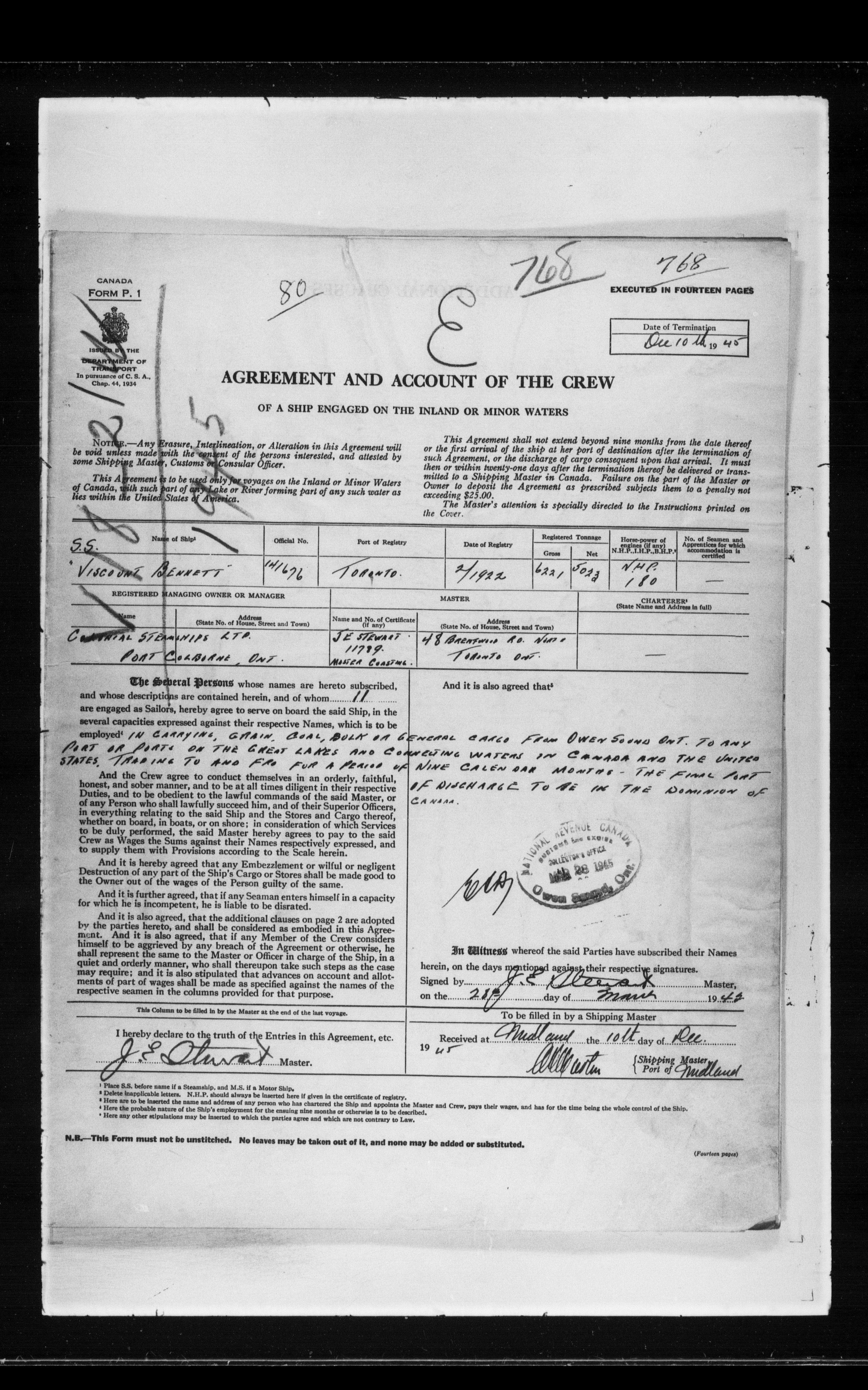 Canadian Marine Transportation Administration, Canadian Coast Guard, Ship Safety Branch, Central Registry of Seamen, Articles of Agreement and Ships' Logs - 11811