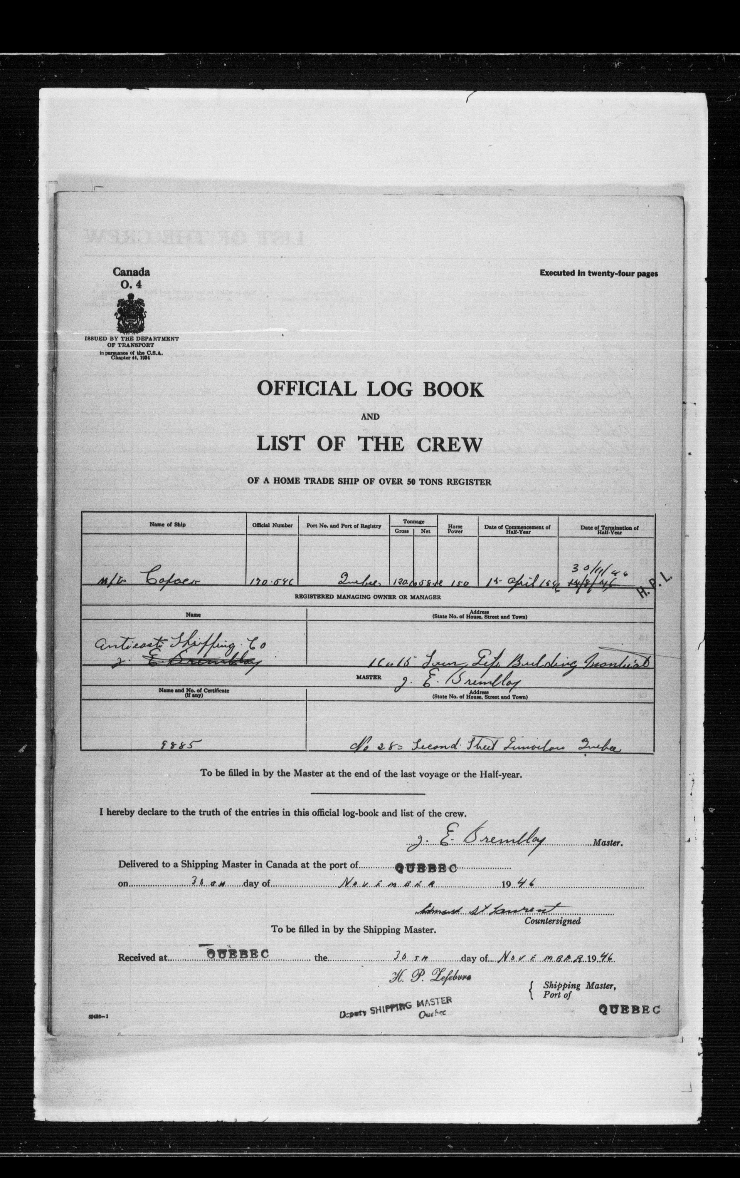 Canadian Marine Transportation Administration, Canadian Coast Guard, Ship Safety Branch, Central Registry of Seamen, Articles of Agreement and Ships' Logs - 11815