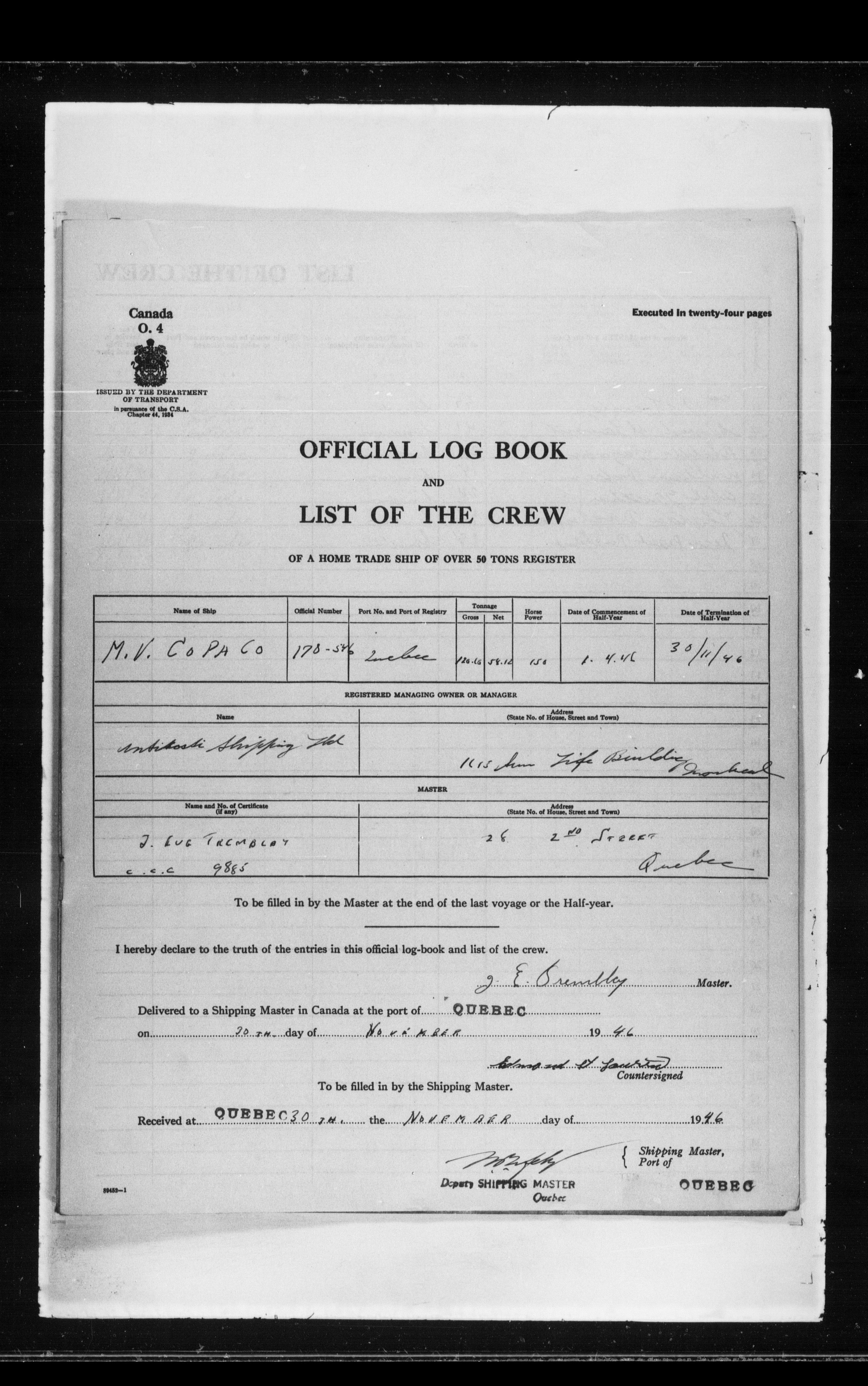 Canadian Marine Transportation Administration, Canadian Coast Guard, Ship Safety Branch, Central Registry of Seamen, Articles of Agreement and Ships' Logs - 11815