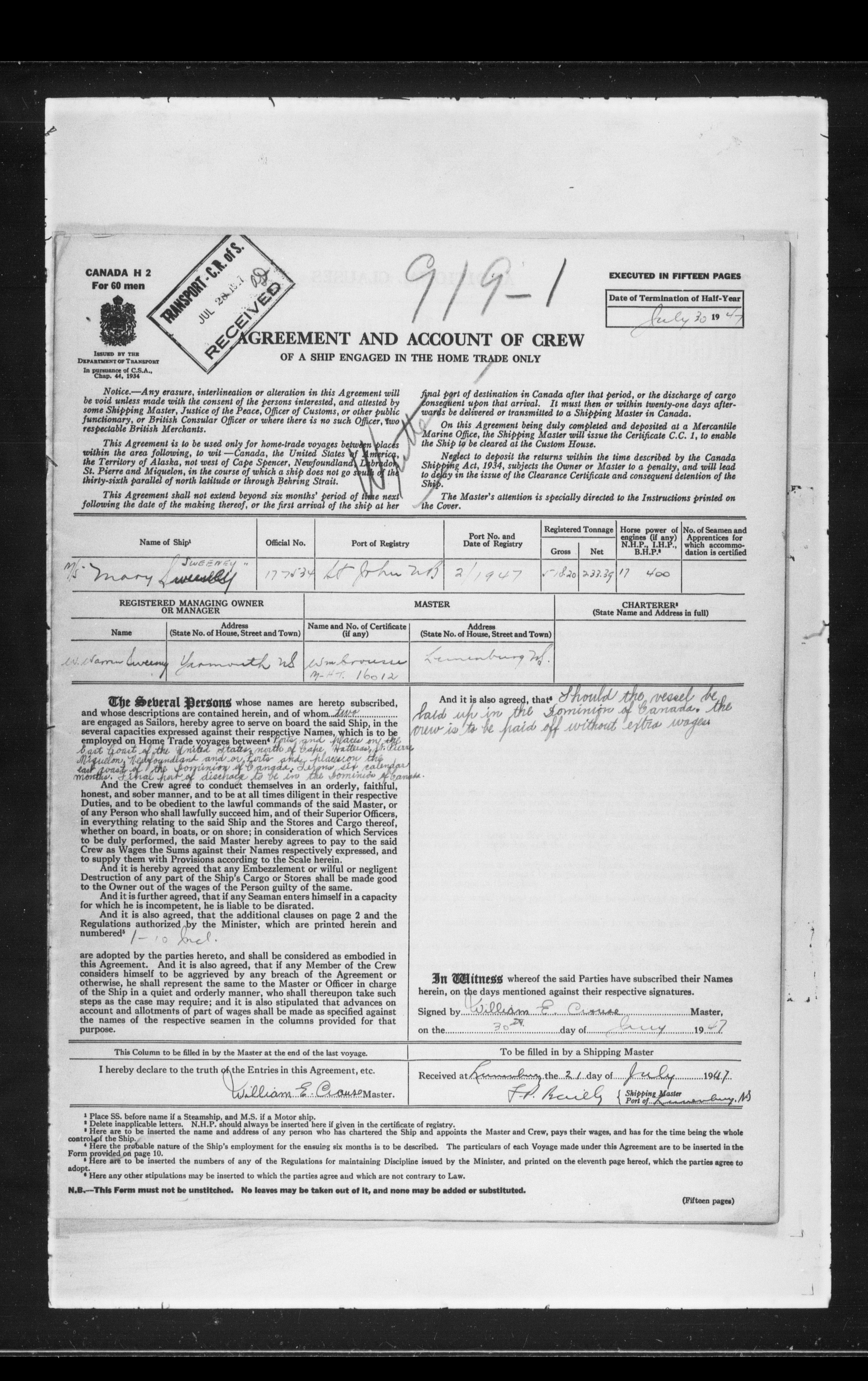 Canadian Marine Transportation Administration, Canadian Coast Guard, Ship Safety Branch, Central Registry of Seamen, Articles of Agreement and Ships' Logs - 11817