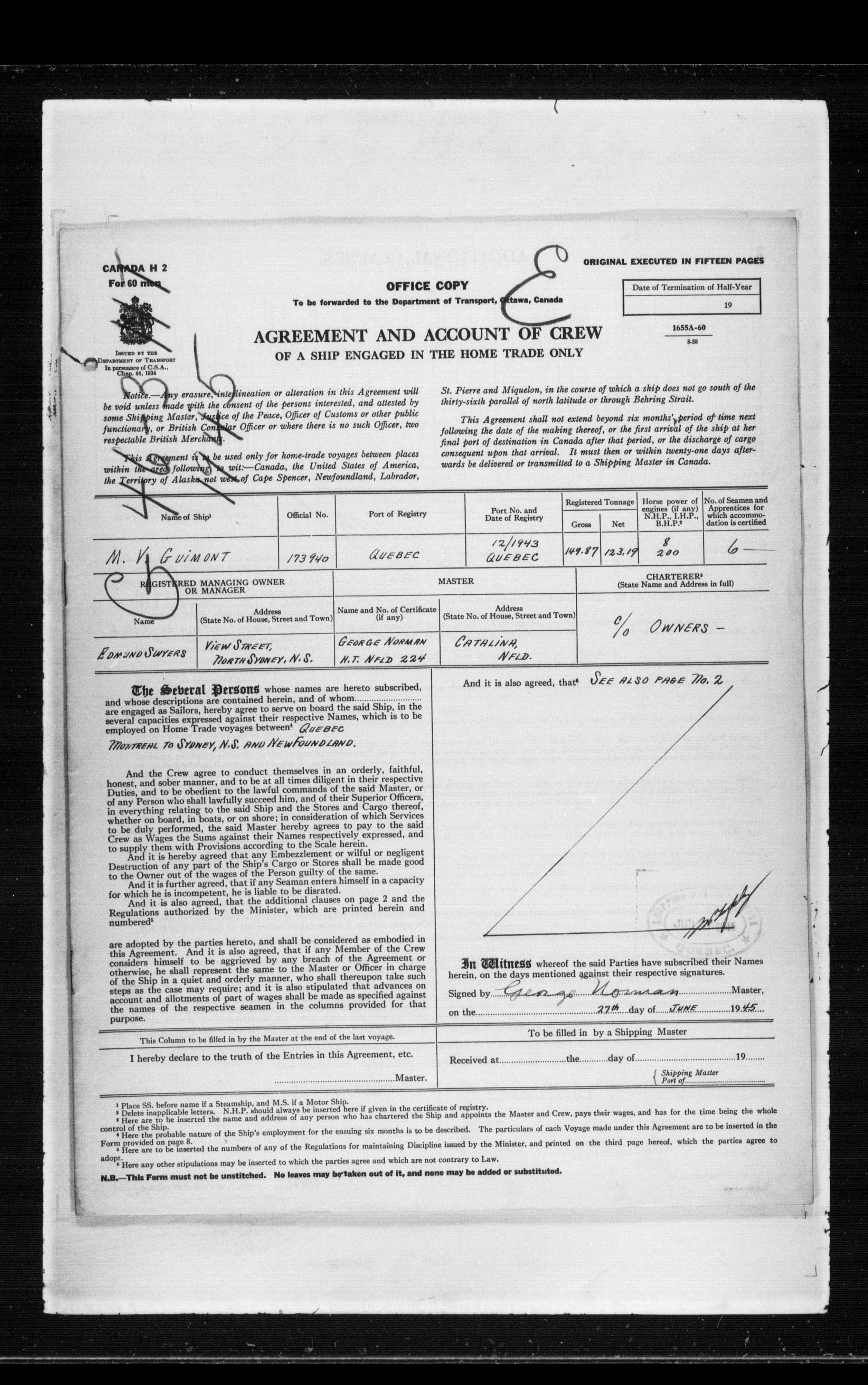 Canadian Marine Transportation Administration, Canadian Coast Guard, Ship Safety Branch, Central Registry of Seamen, Articles of Agreement and Ships' Logs - 11820
