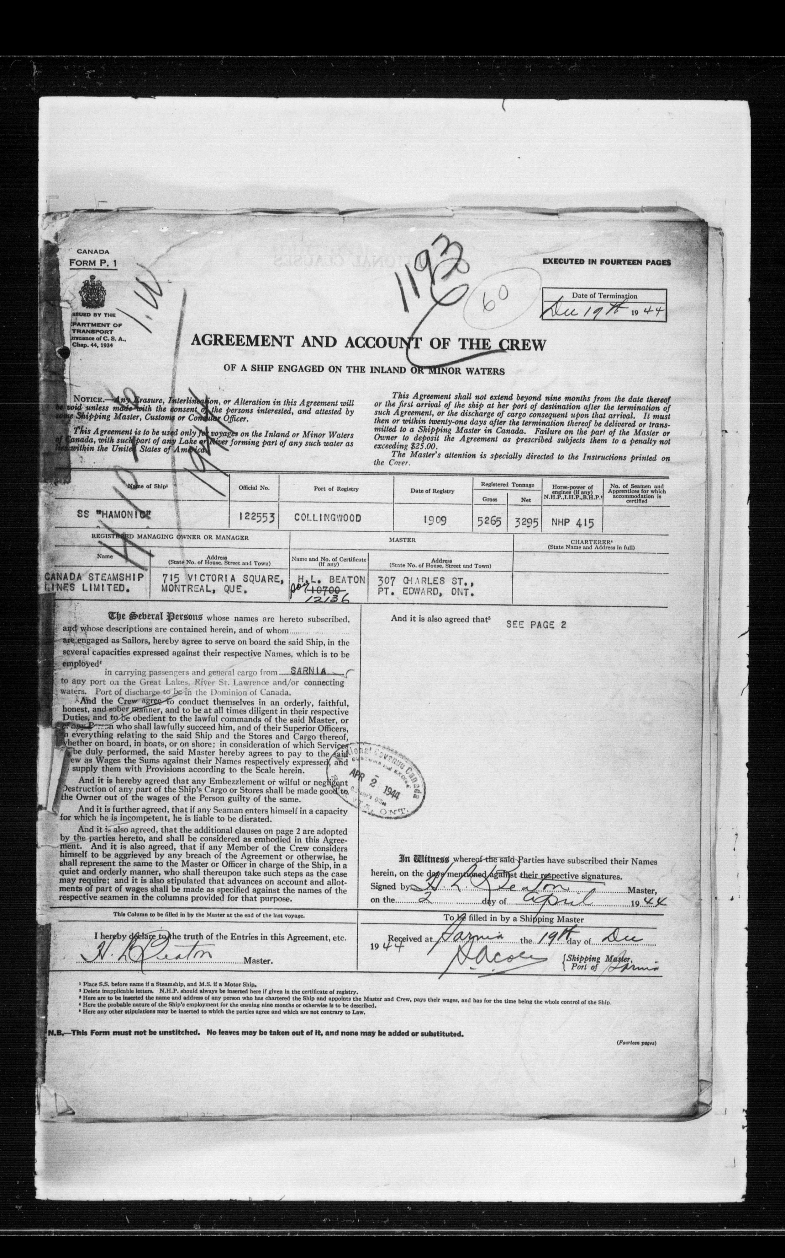 Canadian Marine Transportation Administration, Canadian Coast Guard, Ship Safety Branch, Central Registry of Seamen, Articles of Agreement and Ships' Logs - 11821