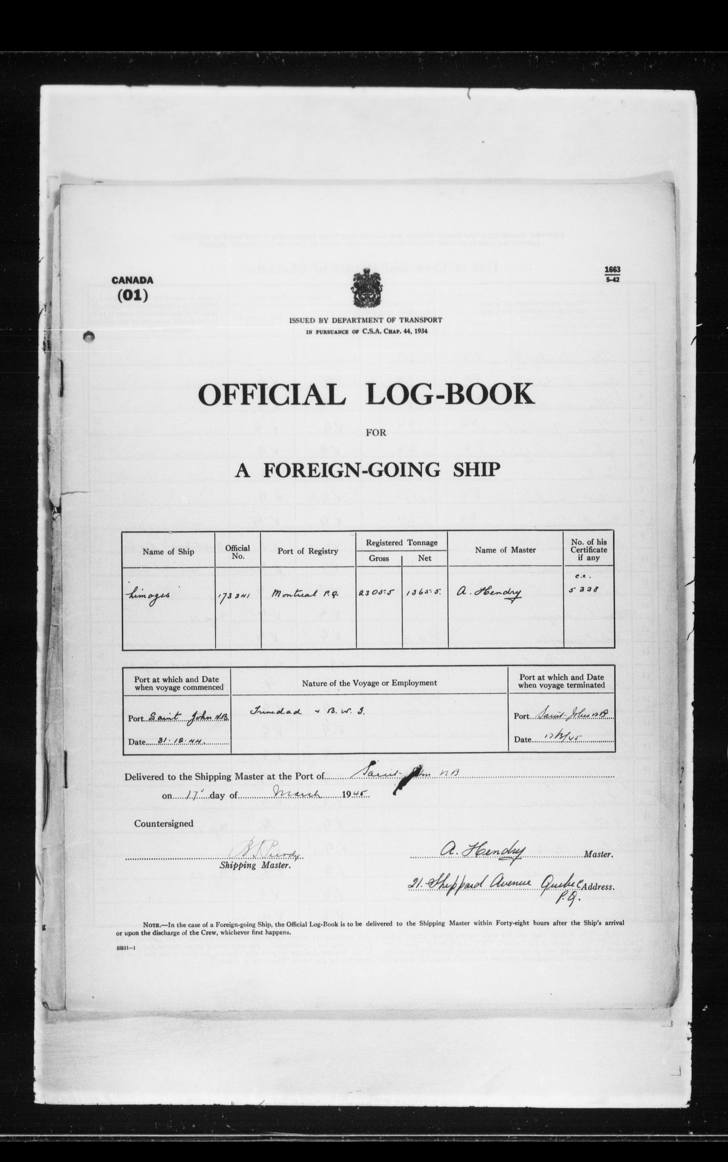 Canadian Marine Transportation Administration, Canadian Coast Guard, Ship Safety Branch, Central Registry of Seamen, Articles of Agreement and Ships' Logs : T-11821