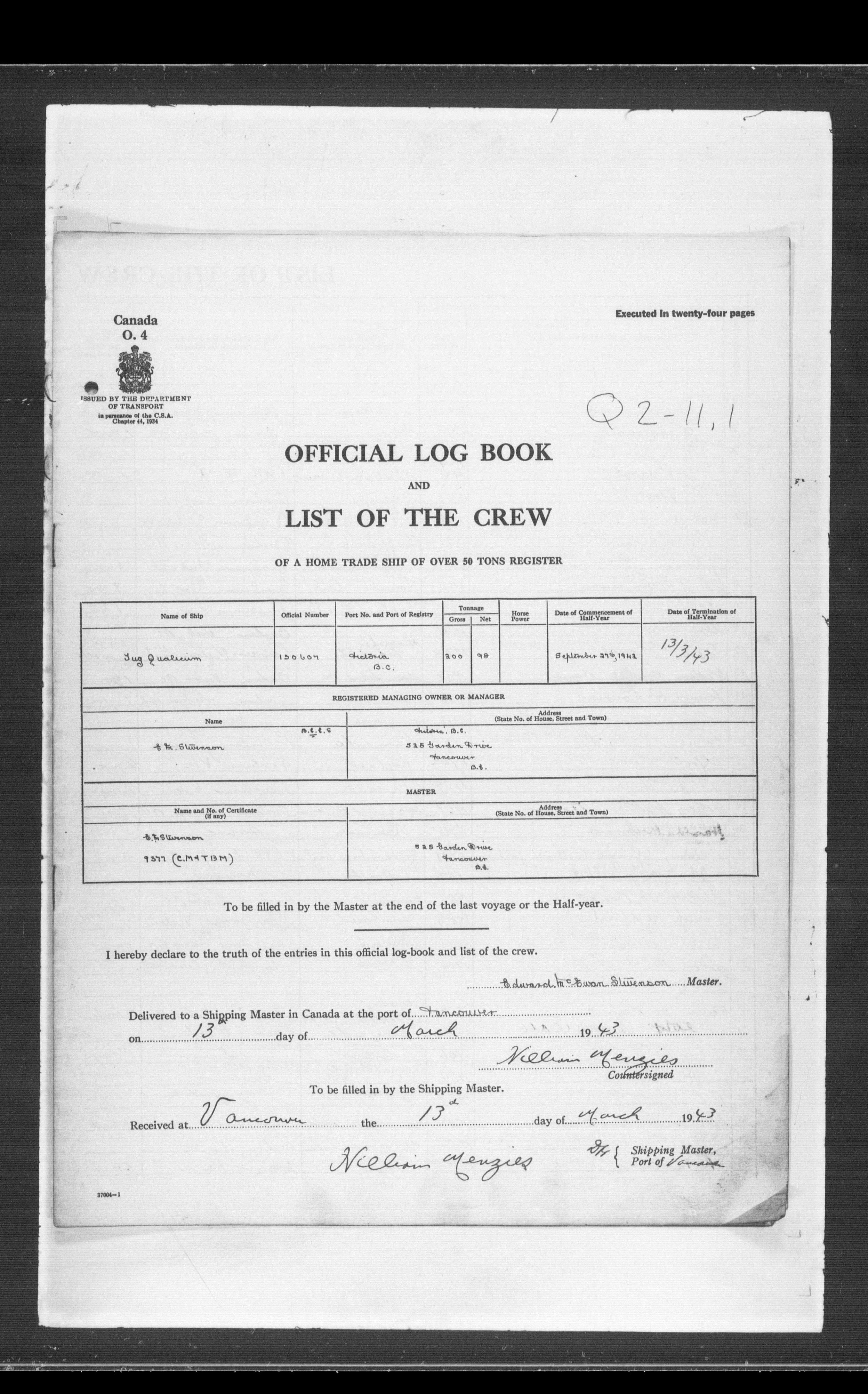 Canadian Marine Transportation Administration, Canadian Coast Guard, Ship Safety Branch, Central Registry of Seamen, Articles of Agreement and Ships' Logs - 11824